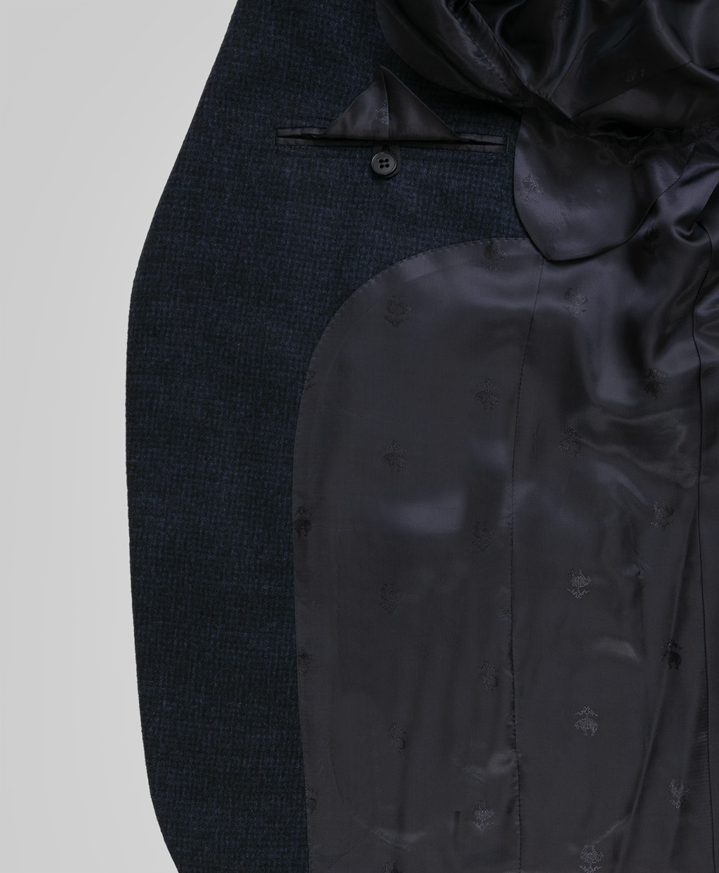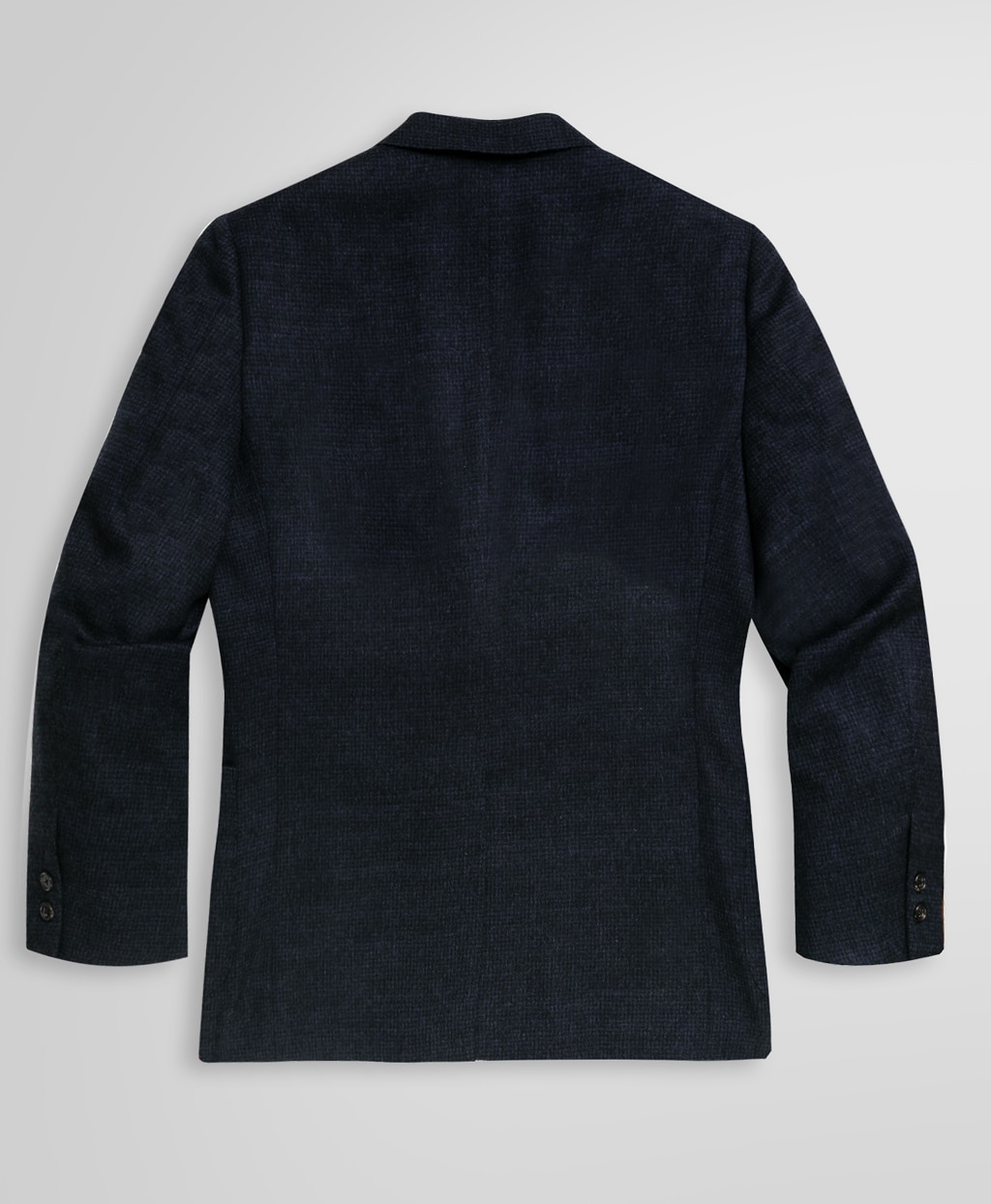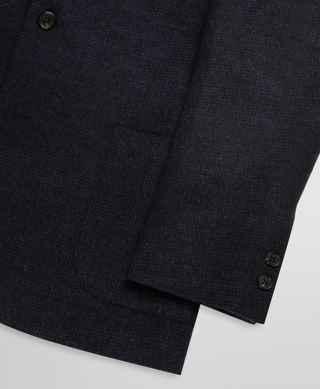 表生地は起毛感があり無地感覚でお召しいただけるマイクロチェック柄にし、裏地にはGF(ゴールデンフリース)ジャカード生地を使用しました。シンプルなシングルのジャケットは、ビジネスシーンにはもちろんカジュアルなドレスダウンにもお薦めです。