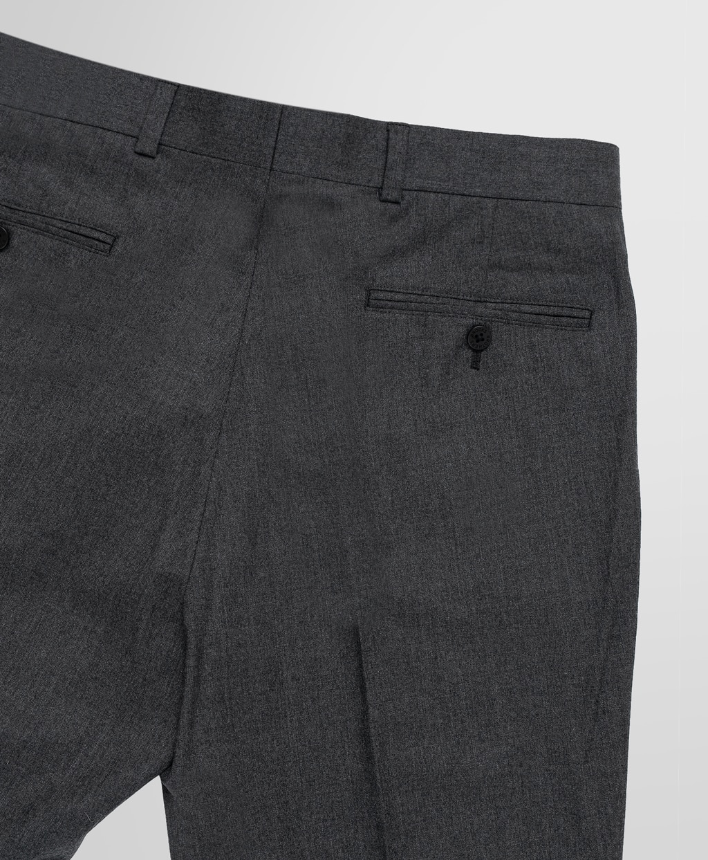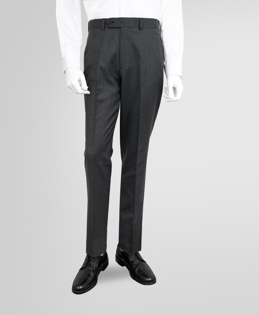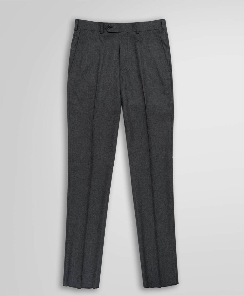 様々な柄のシャツやジャケットとも相性の良い無地のサキソニー地で仕立てました。プレーンフロントでスリムなシルエットのRegentモデルです。