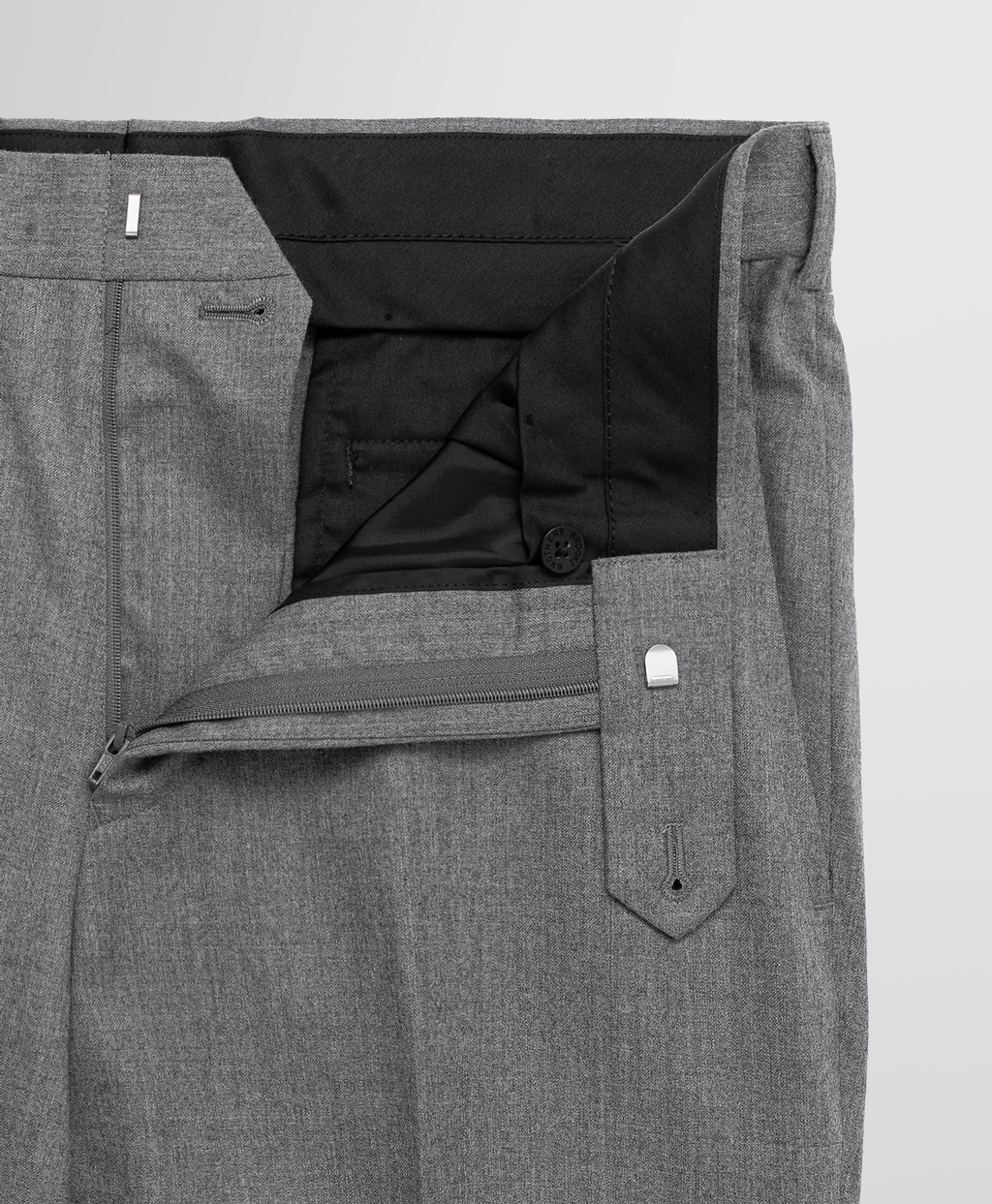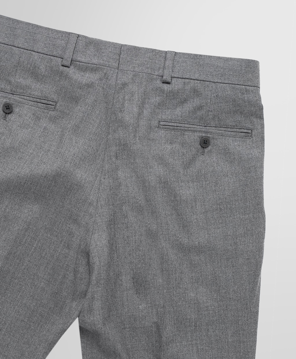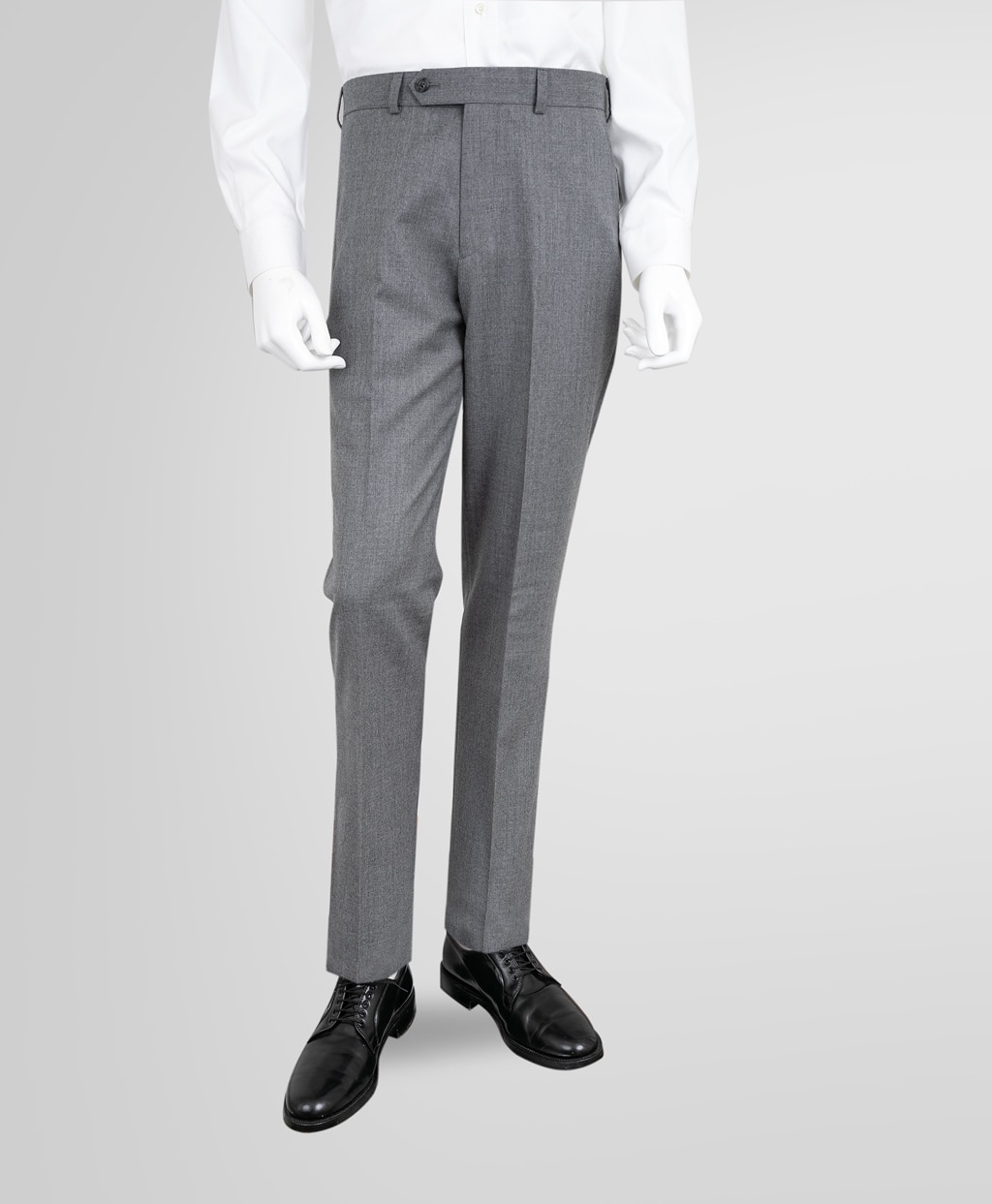 様々な柄のシャツやジャケットとも相性の良い無地のサキソニー地で仕立てました。プレーンフロントでスリムなシルエットのRegentモデルです。