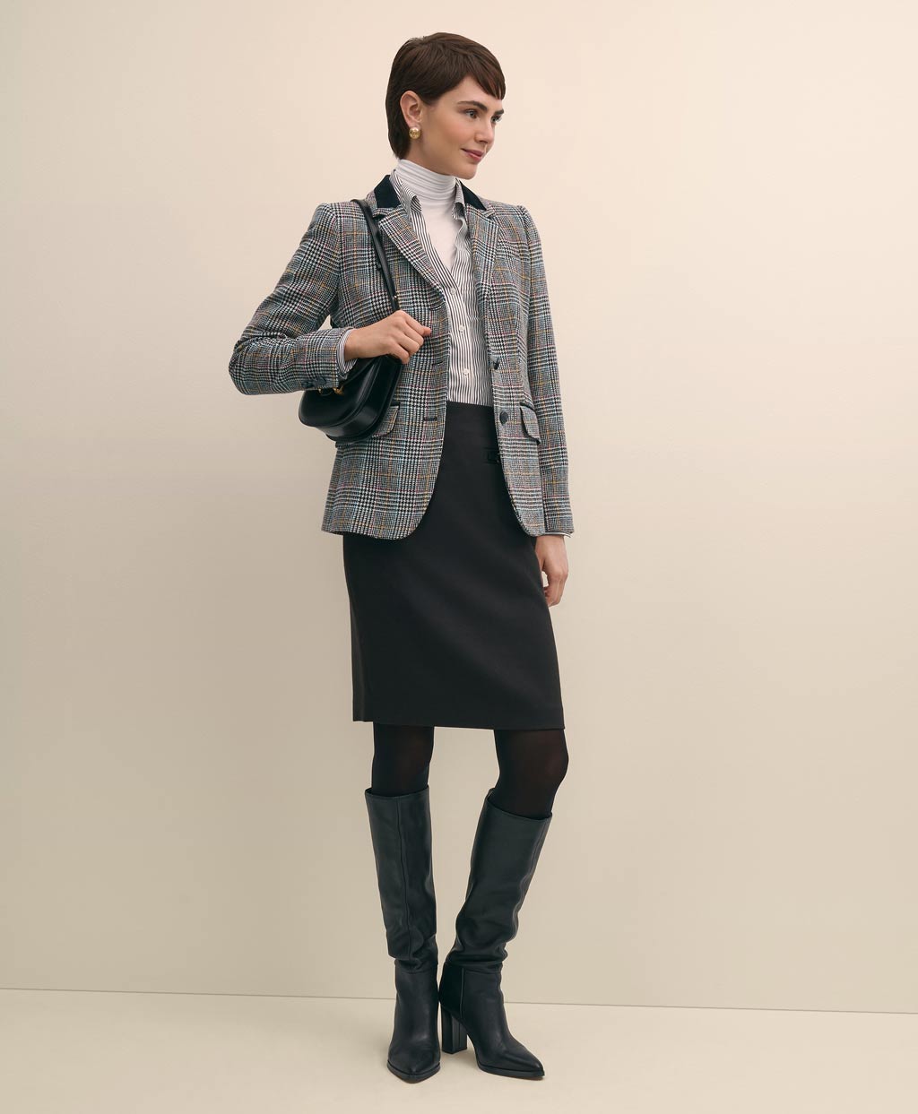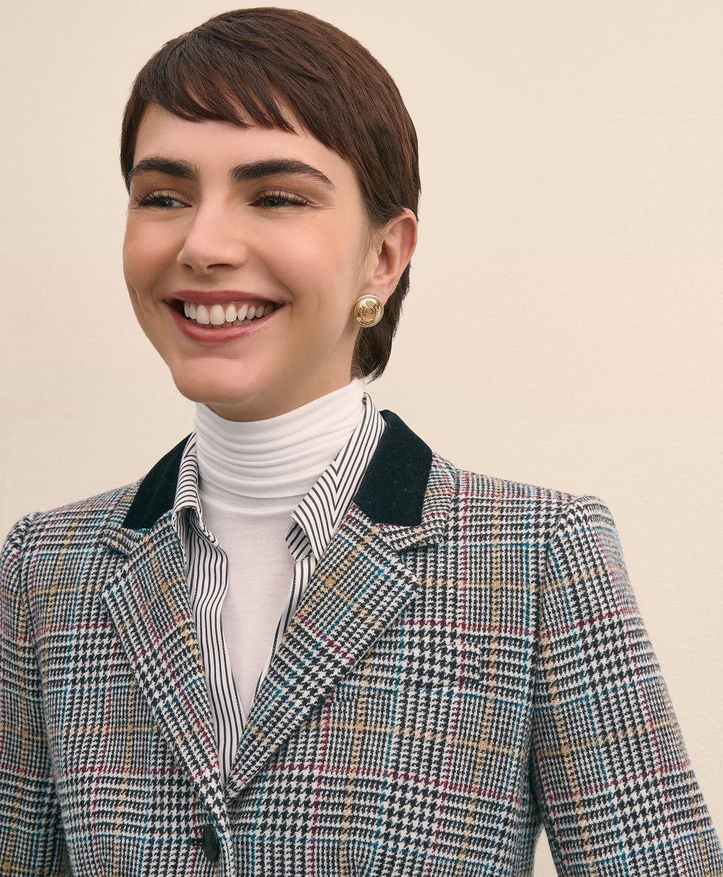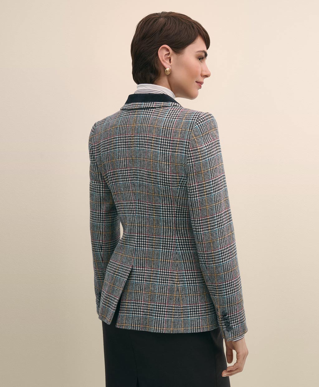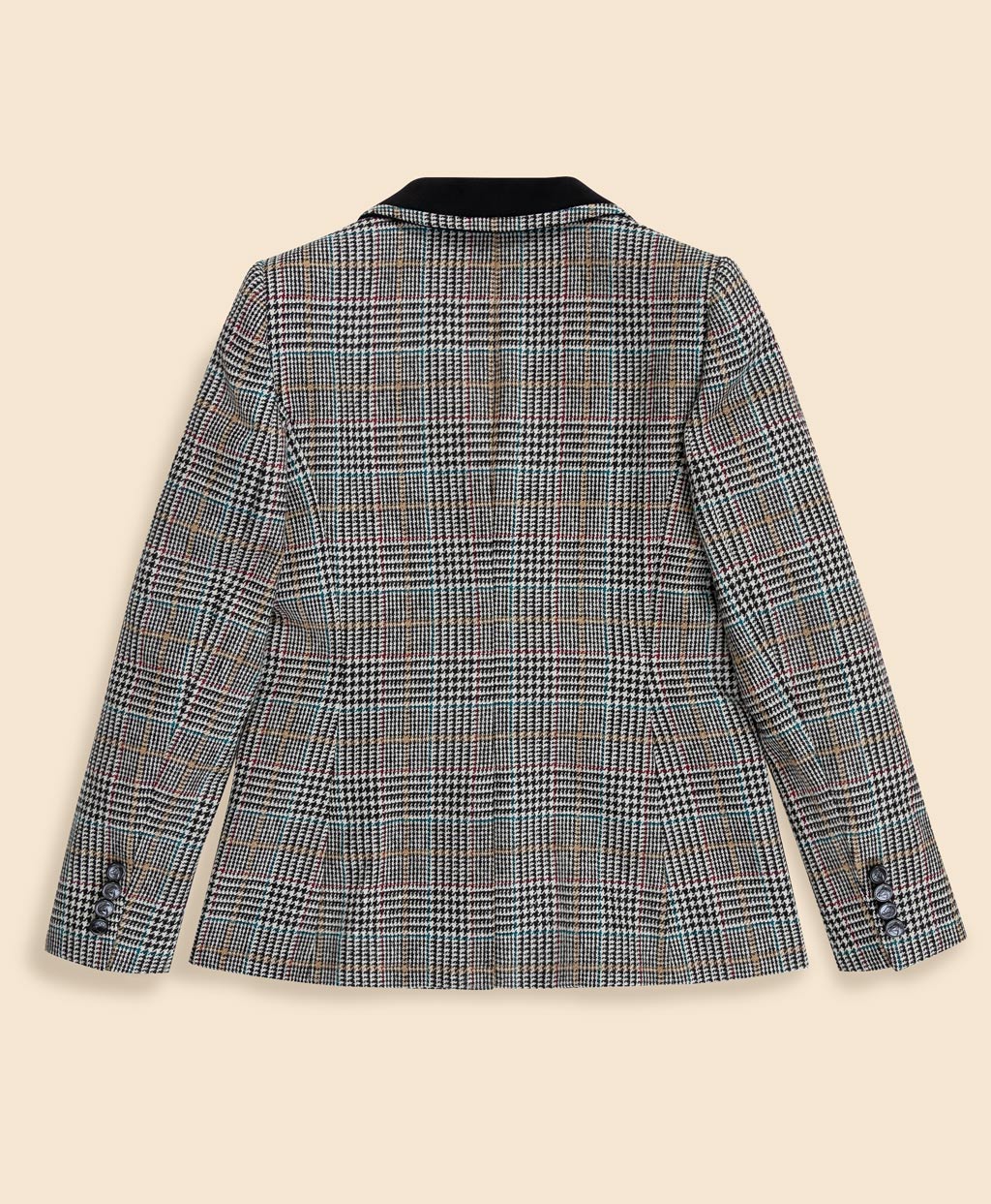 軽やかでぬくもりのある質感と独特の風合いで知られるシェットランドウールを使用。レッドやブルーなどアクセントカラーを織り込んだクラシックなチェック柄を主役に、上襟とポケットにあしらわれたベルベット、本革のホースエンブレムボタンなど、当時の乗馬ジャケットによく見られるディテールを加えました。クラシックスタイルの普遍的な魅力を宿した一着です。