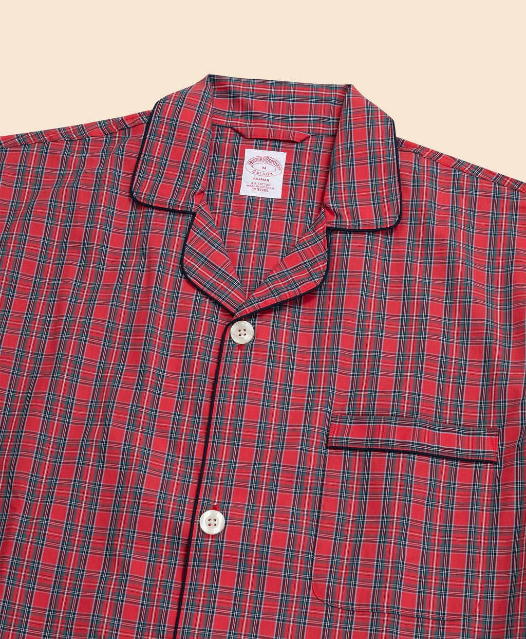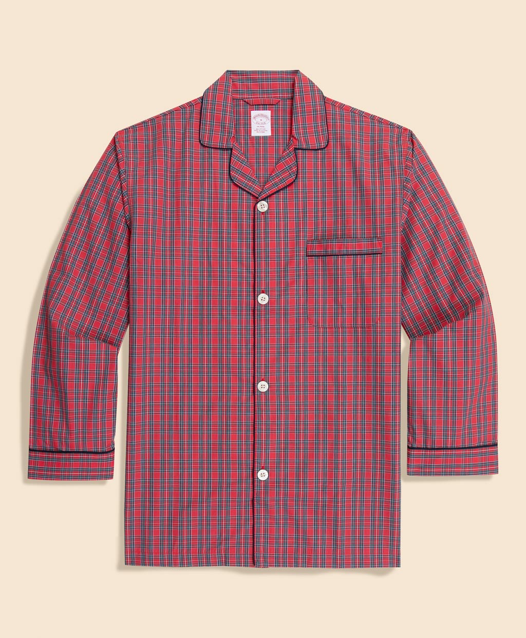 本体に化繊を使用しておらず100%コットンなので、肌に優しく吸水性と通気性に優れ、寝具と擦れ合っても静電気が起こりにくい快適な着心地です。ブルックス ブラザーズらしいトラディショナルな雰囲気のタータンチェック柄。襟回りや袖口などに施したパイピングがアクセントです。
