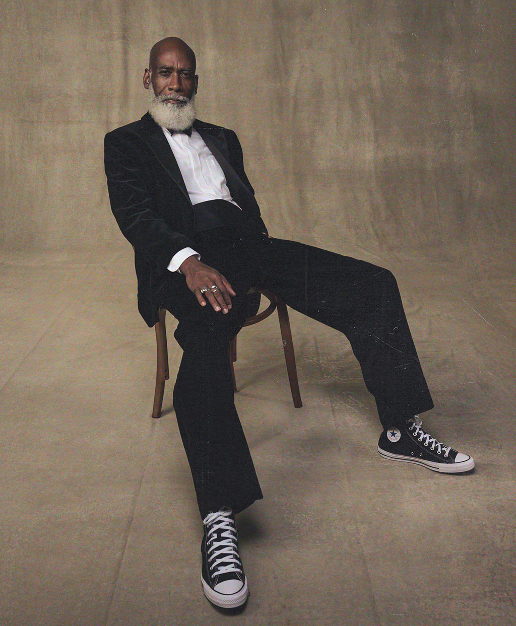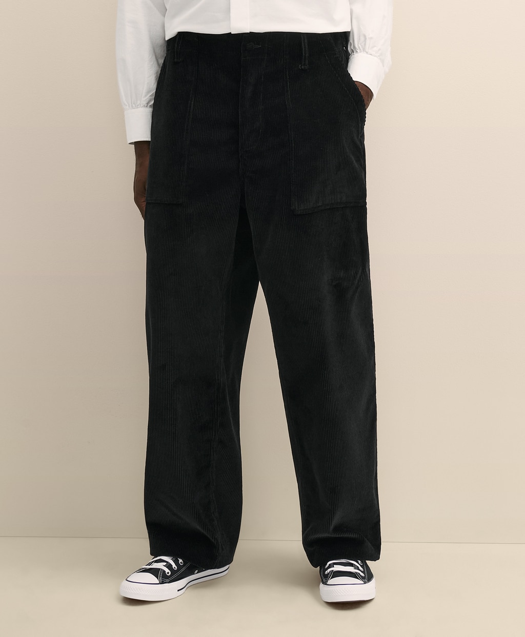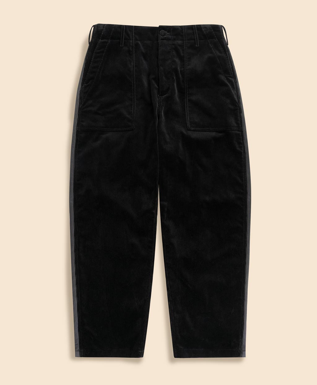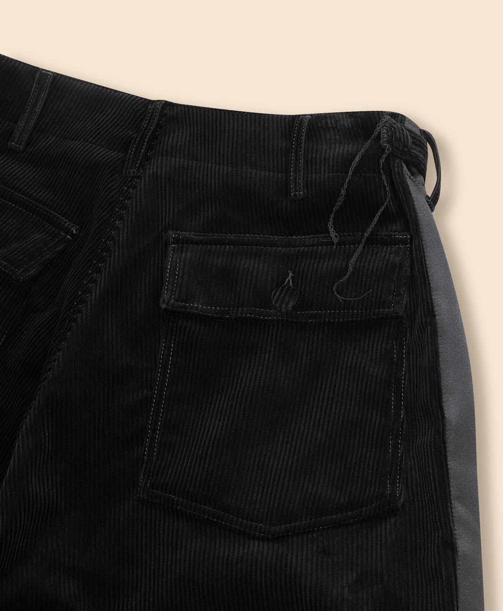 アメリカ軍の作業用パンツをベースにしたファティーグパンツは、エンジニアド ガーメンツを象徴するアイテムの一つです。これにタキシードパンツ由来の側章(サイドストライプ)をあしらい装飾性を加えることで、無骨なミリタリーウェアにエレガンスを融合させました。生地には、8ーWaleの太畝コーデュロイを採用。その艶やかで濃密なブラックは、意外にも本来のタキシードパンツに通ずるエレガンスを秘めていることを再発見させます。縫い目から長く垂らされたロックミシンの糸や迫力あるワイドシルエットなど、本コラボレーションだからこそ実現した挑戦的なディテールが独創性を際立たせる、特別な一本です。