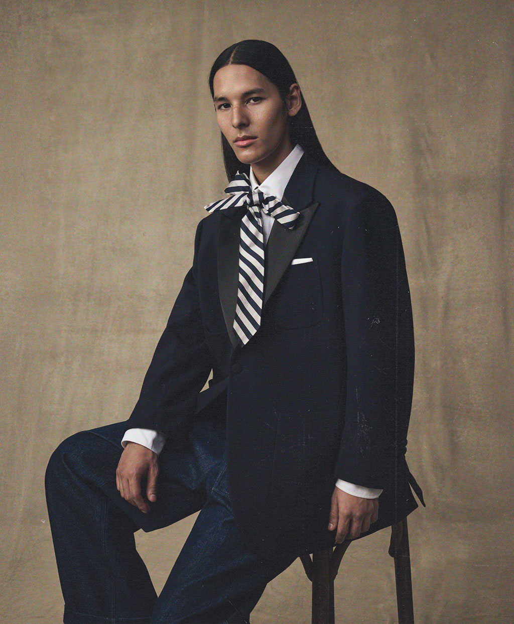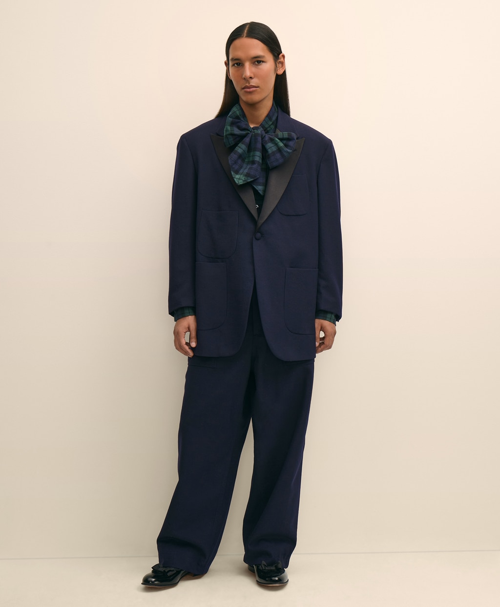 華やかな光沢を放つシャープなピークドラペル、本体生地の共布でくるまれたボタンなど、タキシードジャケットの格式ある様式を忠実に踏襲しながら、素材にはユニフォームやブレザーに使用されることの多いウールサージ生地を採用しました。ワークジャケットを思わせる複数のパッチポケットや、ラフな雰囲気のオーバーサイズシルエットといった、フォーマルとは相反するカジュアルな要素が大胆に組み込みまれ、コントラストの効いたルックスを生み出しています。タキシードジャケットの伝統的なディテールを保持しながらも、ドレスコードから解放され、より自由なワードローブへと進化した革新的な一着です。
