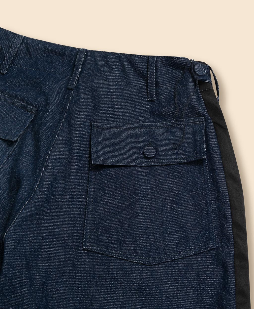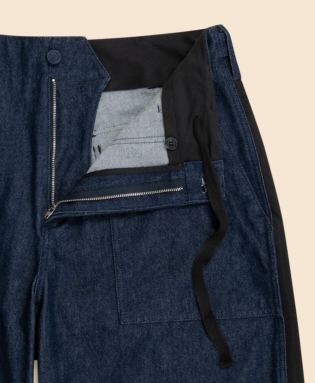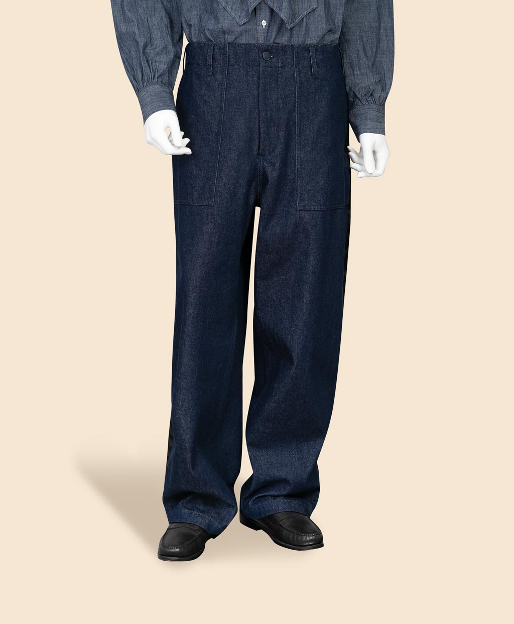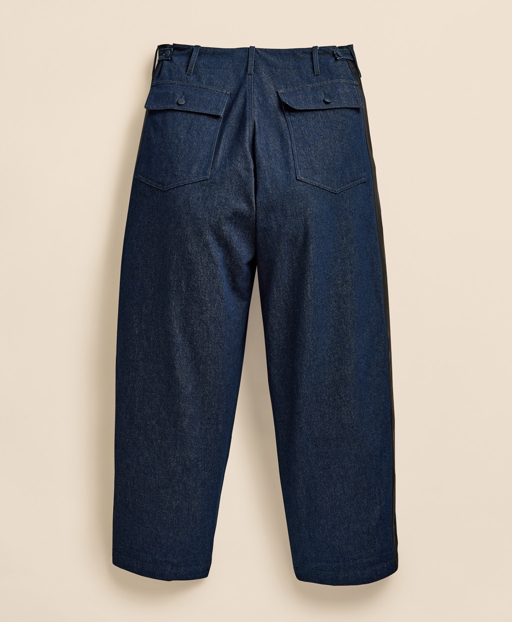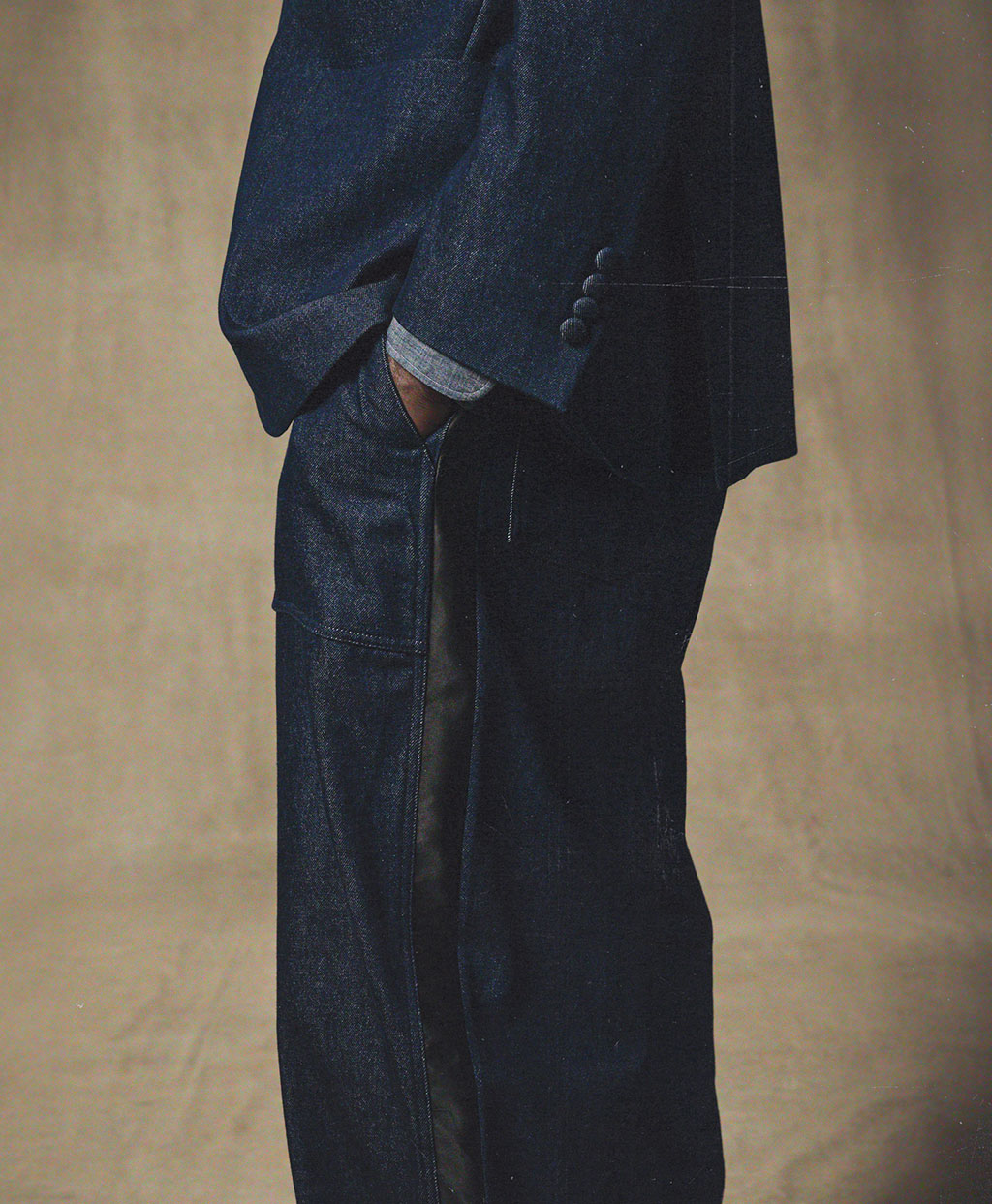 アメリカ軍の作業用パンツをベースにしたファティーグパンツは、エンジニアド ガーメンツを象徴するアイテムの一つです。これにタキシードパンツ由来の側章(サイドストライプ)をあしらい装飾性を加えることで、無骨なミリタリーウェアにエレガンスを融合させました。生地には、ワークウェアの象徴であるデニム生地を採用。縫い目から長く垂らされたロックミシンの糸や迫力あるワイドシルエットなど、本コラボレーションだからこそ実現した挑戦的なディテールが独創性を際立たせる、特別な一本です。