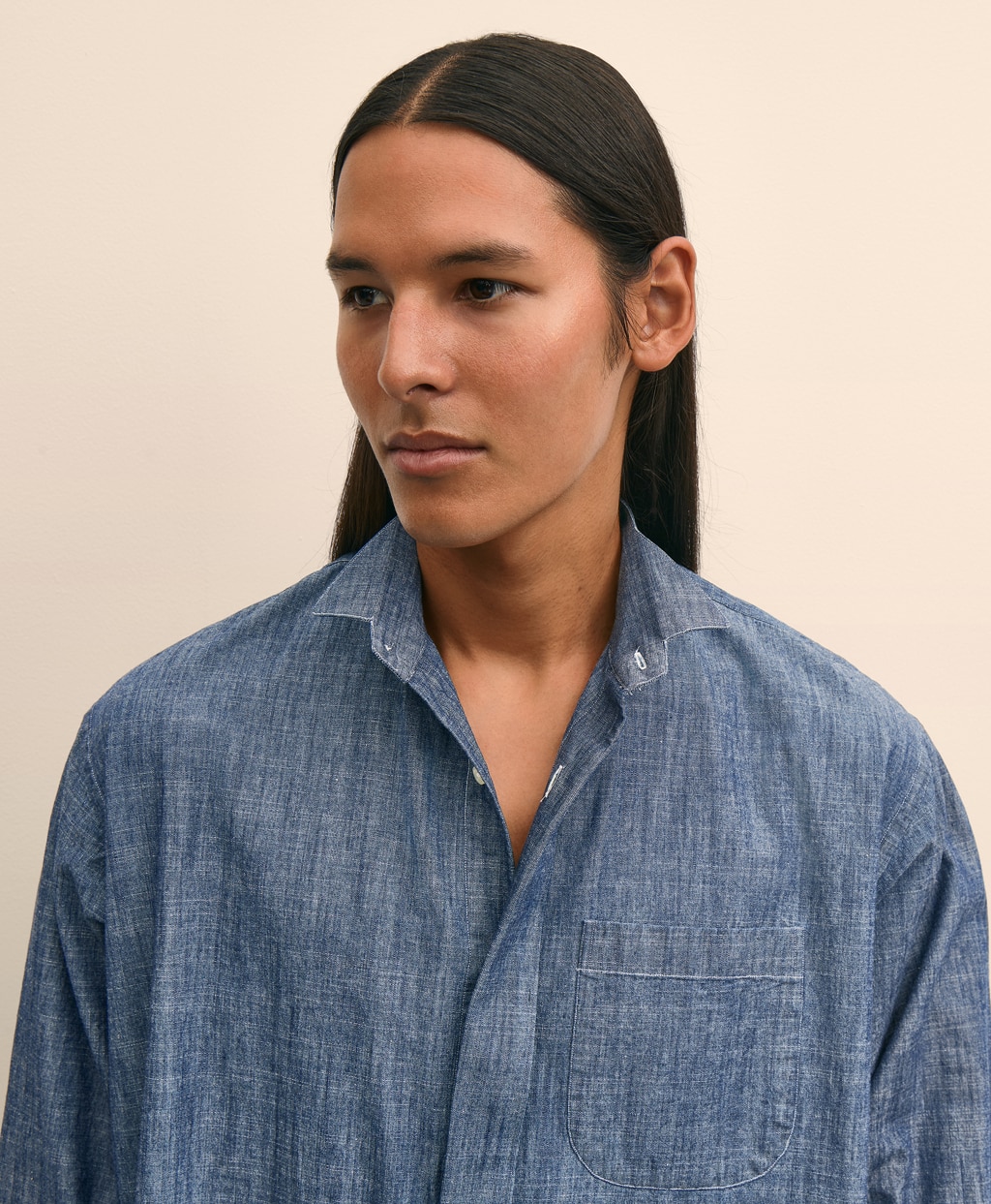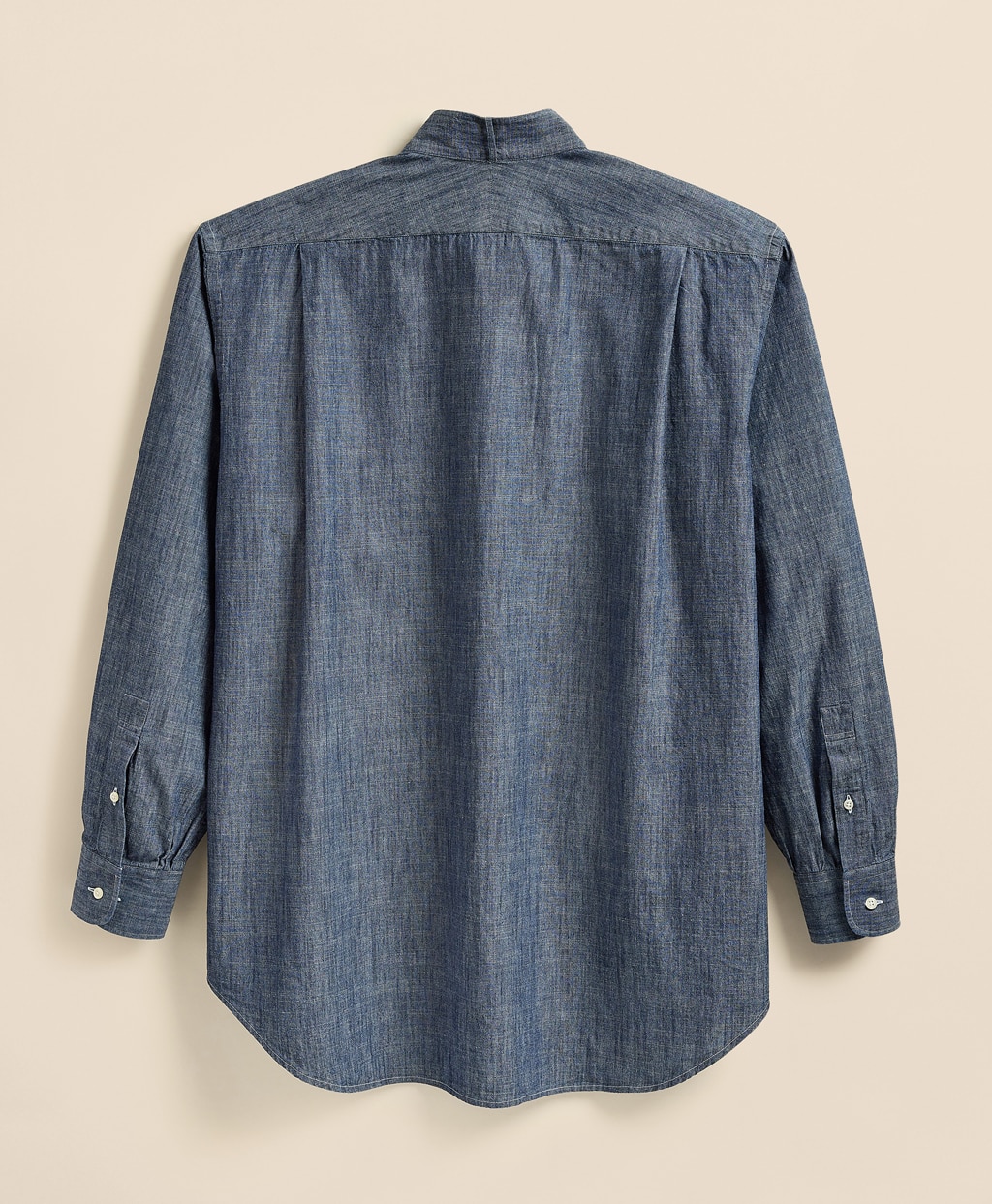 格式の高いフォーマルなシーンで着用されるウイングカラーシャツをワークウェアのアイコンであるシャンブレー生地で再構築
