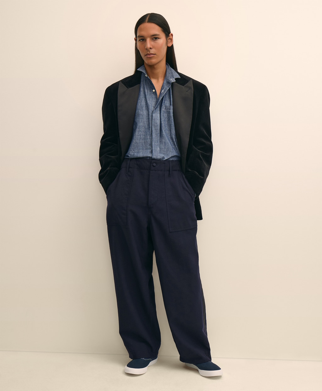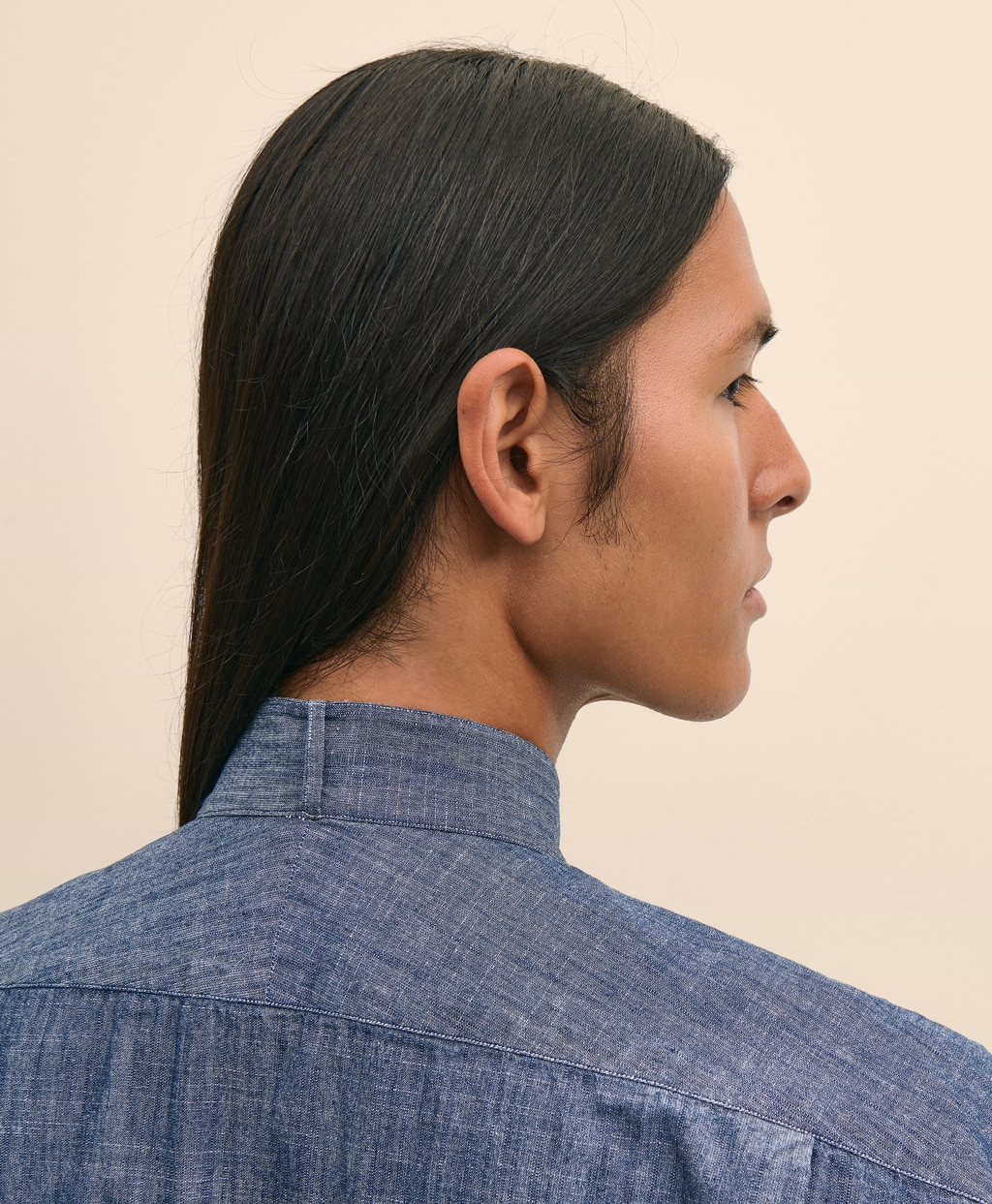 ボウタイやアスコットタイといったフォーマルなタイを美しく見せることに特化したウイングカラーシャツをベースに、アメリカの鉱山労働者や農夫のワークウェアとして愛用されていた歴史を持つシャンブレー生地を用いて仕立てました。ドレッシーな様式美にシャンブレー生地特有の霜降り状のムラと軽やかなラフさを組み込むことで、フォーマルとワークの意図的なコントラストを効かせたルックスを生み出しています。本コレクションのコンセプトを凝縮した一着です。