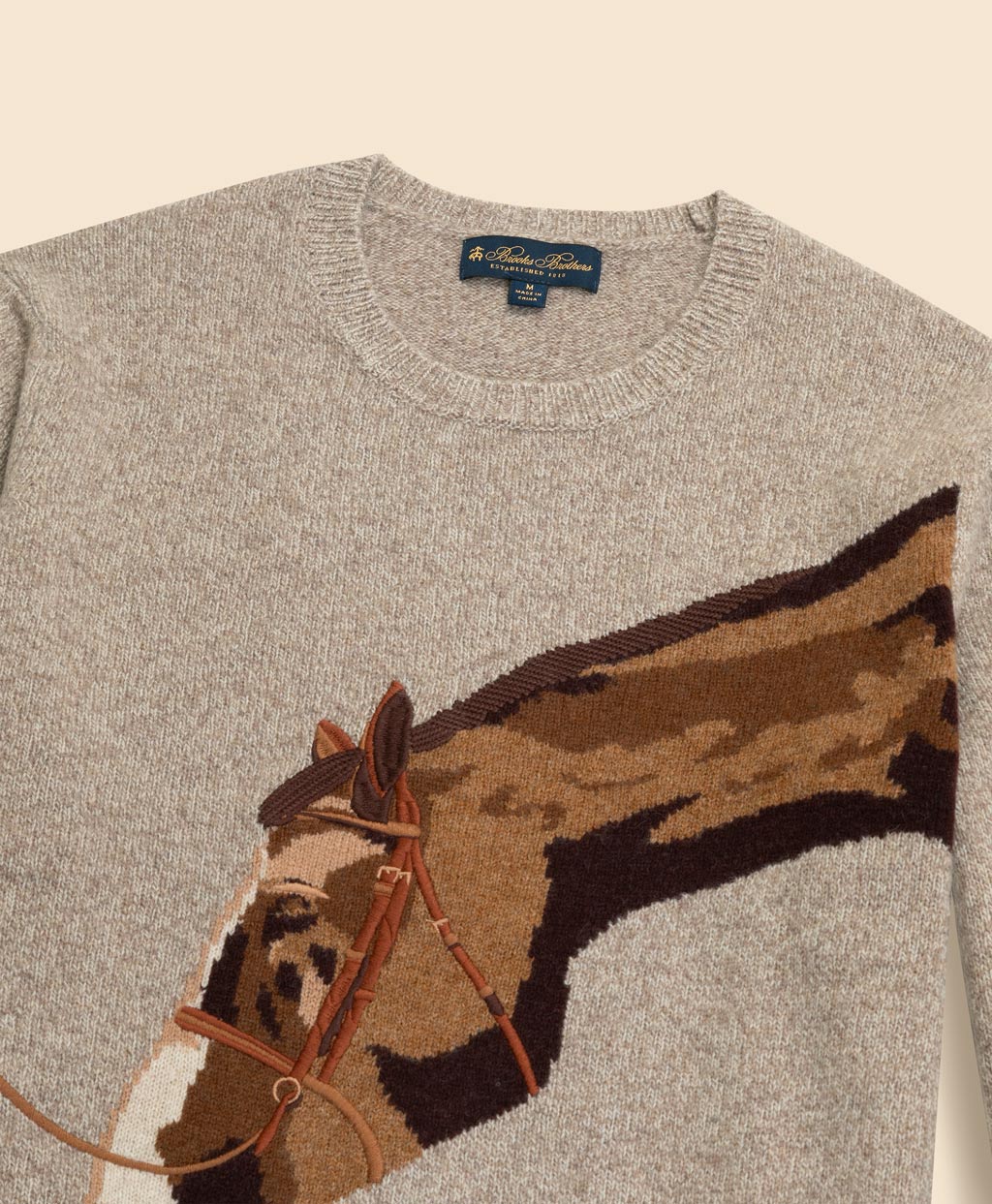 クラシックな世界観のホースモチーフを編み込んだクルーネックセーター