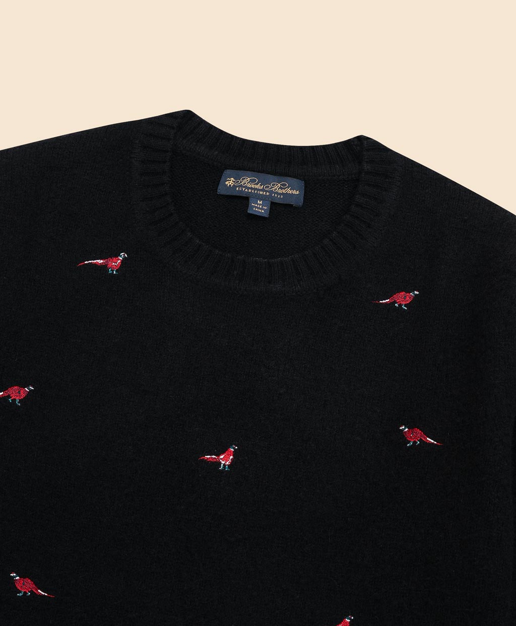 暖かみのあるブラッシュドウールのセーターにあしらわれた、英国の田園風景を思わせるフェザント(キジ)の姿。ブラックのボディに刺繍された赤い羽根のコントラストが鮮やかな一枚です。