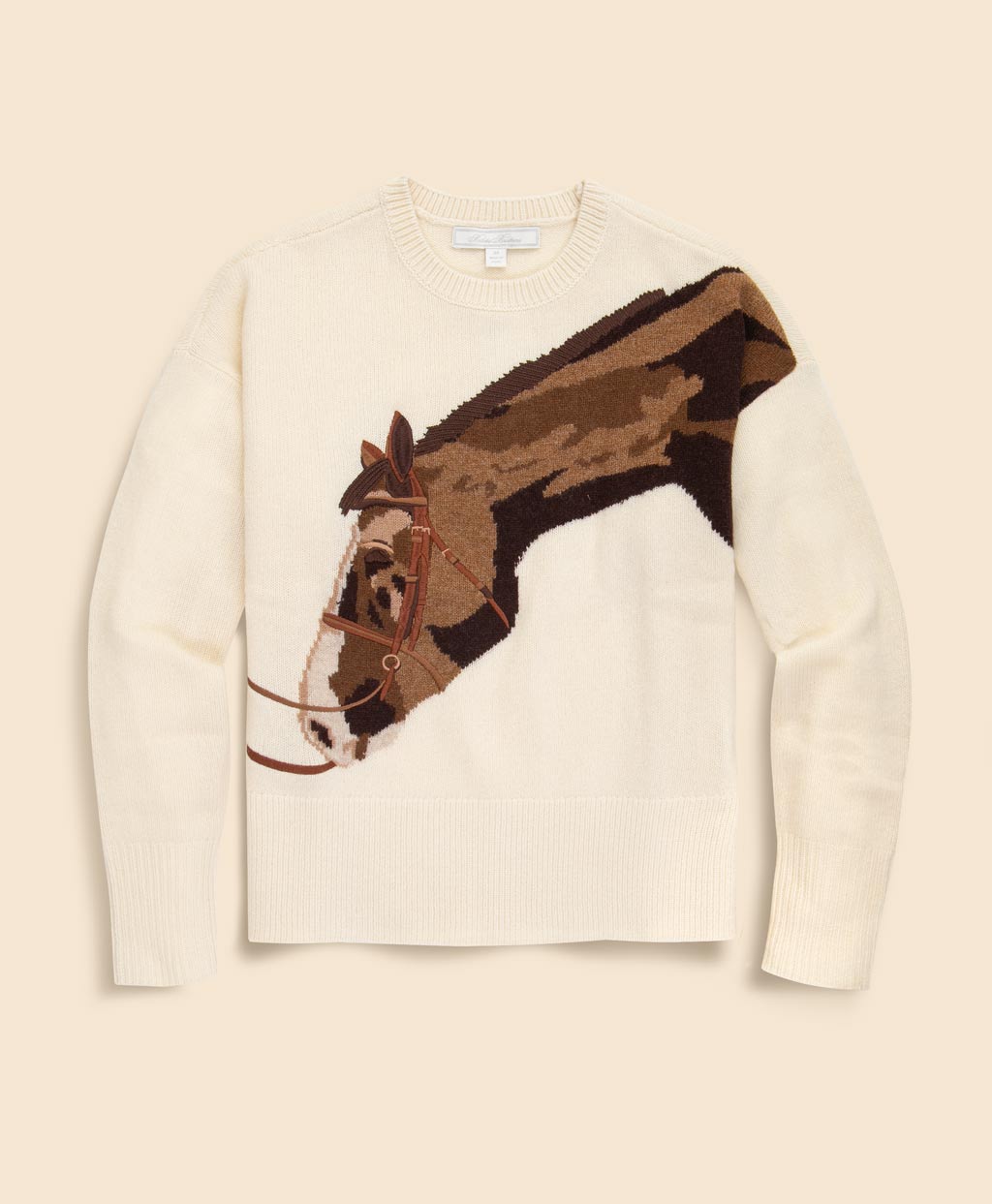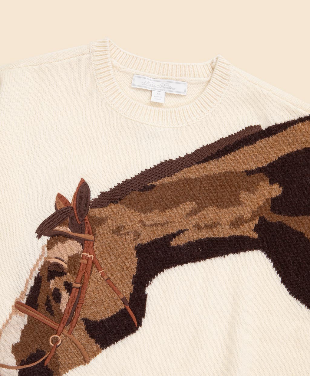 クラシックな世界観のホースモチーフを編み込んだクルーネックセーター
