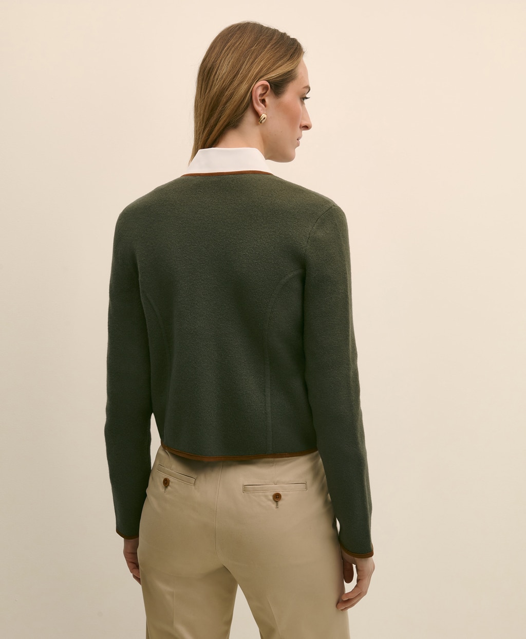カーディガンのように気軽に羽織れる、ニット生地を用いたジャケット。イタリアの高級服地メーカーTollegno社製の密度の高いニット素材が保温性と美しい立体感を保ち、オフィスルックからプライベートのデイリーな装いまで幅広く活躍します。スウェードのトリムとGF(ゴールデン フリース)ロゴが刻印されたメタルボタンをアクセントに、クラシカルに仕上げました。キュロットやAラインのスカート、ボウタイ付きのブラウスなどを合わせて甘さをプラスするスタイリングもおすすめです。