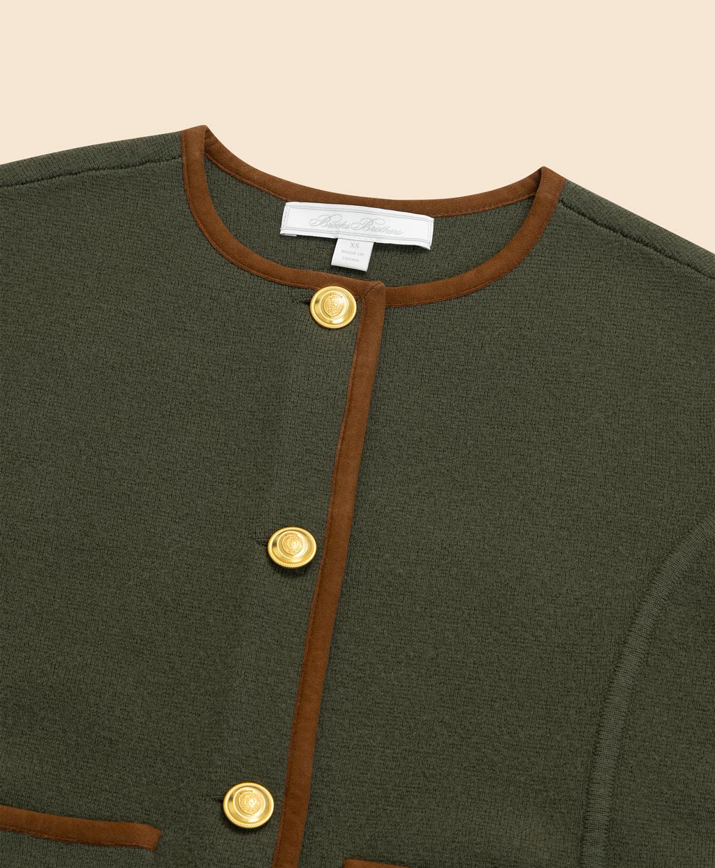 ゴールドメタルボタンとリアルスウェードが織りなす、レトロクラシカルなムードが印象的なニットジャケット
