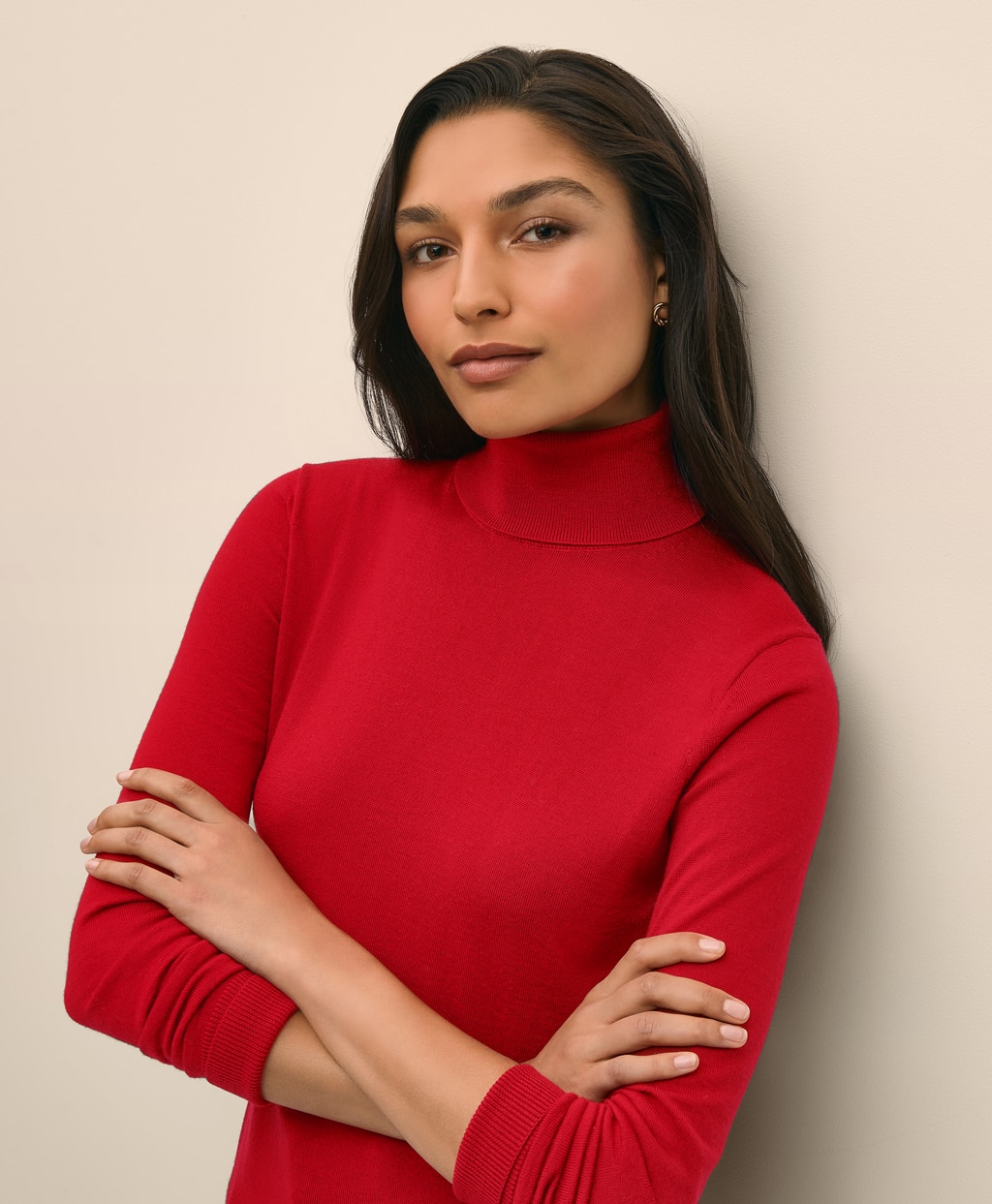 ハイゲージで編み上げた薄手のタートルネックセーターです。イタリアの高級服地メーカーTollegno社のメリノウール糸を用いた、なめらかで柔らかく暖かな素材感が魅力。ベーシックなカラーリングのシンプルなタートルネックセーターは、1枚ではもちろん、ジャケットやシャツ、ノースリーブドレスのインナーとしても活躍する秋冬のスタイリングに欠かせないアイテムです。