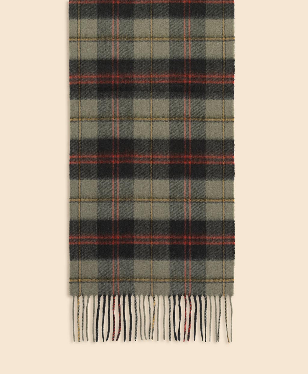 カシミヤは上品な光沢があり、軽くて柔らか、それでいて保温性にも優れ、何よりも肌触りの良さが特徴です。オリーブ主体のタータンチェックにオレンジのラインが生えます。落ち着いた配色なので、スタイルのワンポイントとしてお楽しみいただけます。トレンドに左右されることなく、年齢性別を問わずお使いいただける上質なマフラーは、ギフトにもお薦めです。