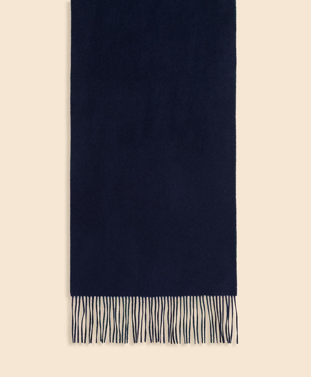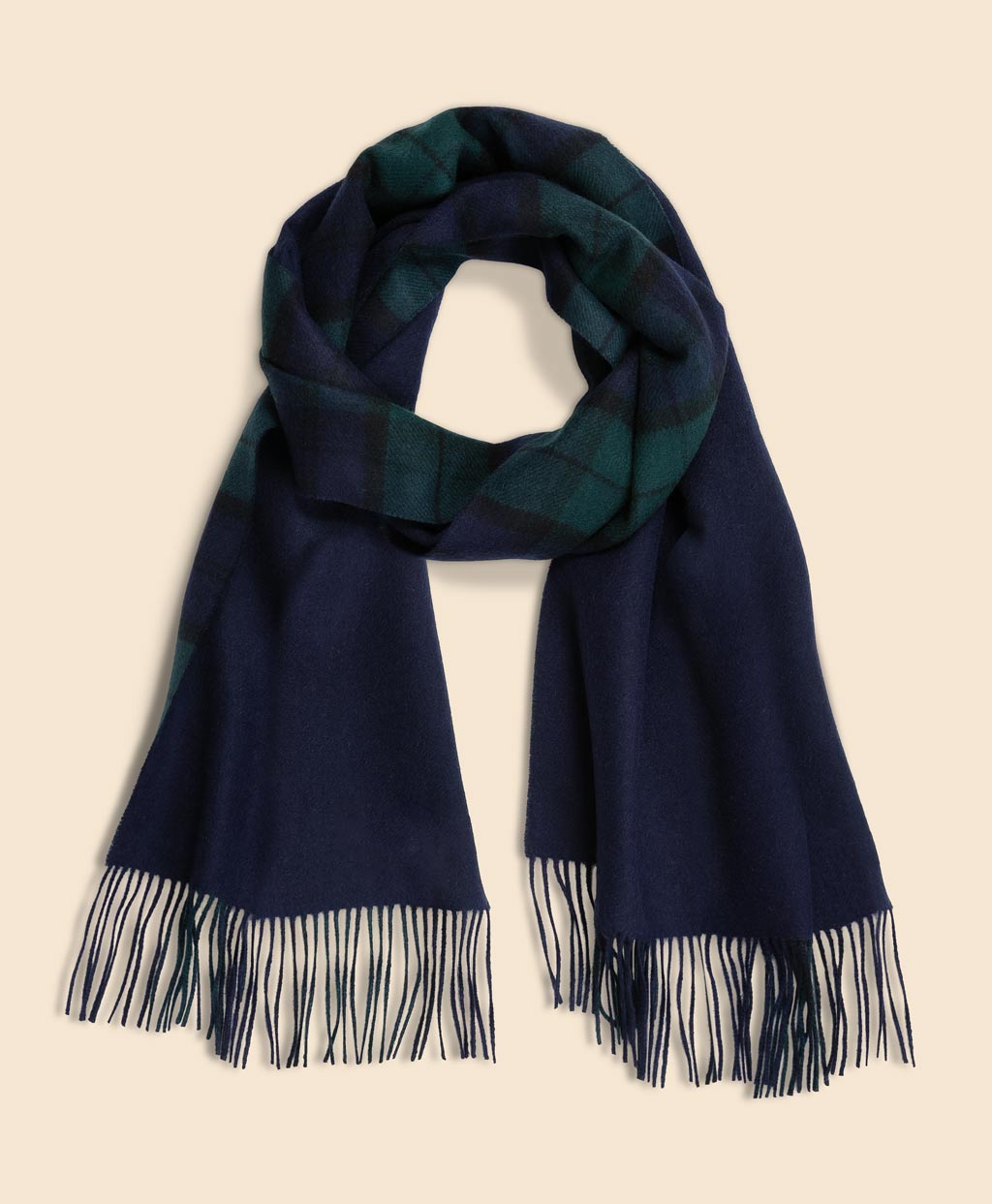 表裏にブラックウォッチ柄と単色のネイビーを配したダブルフェイス仕様。巻き方によって二つの色の見え方に変化が生まれ、幅広いコーディネートで活躍します。