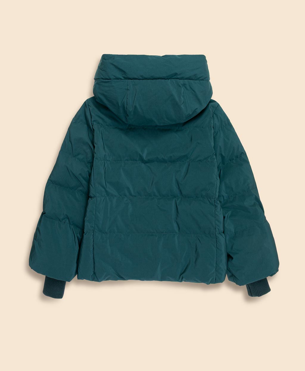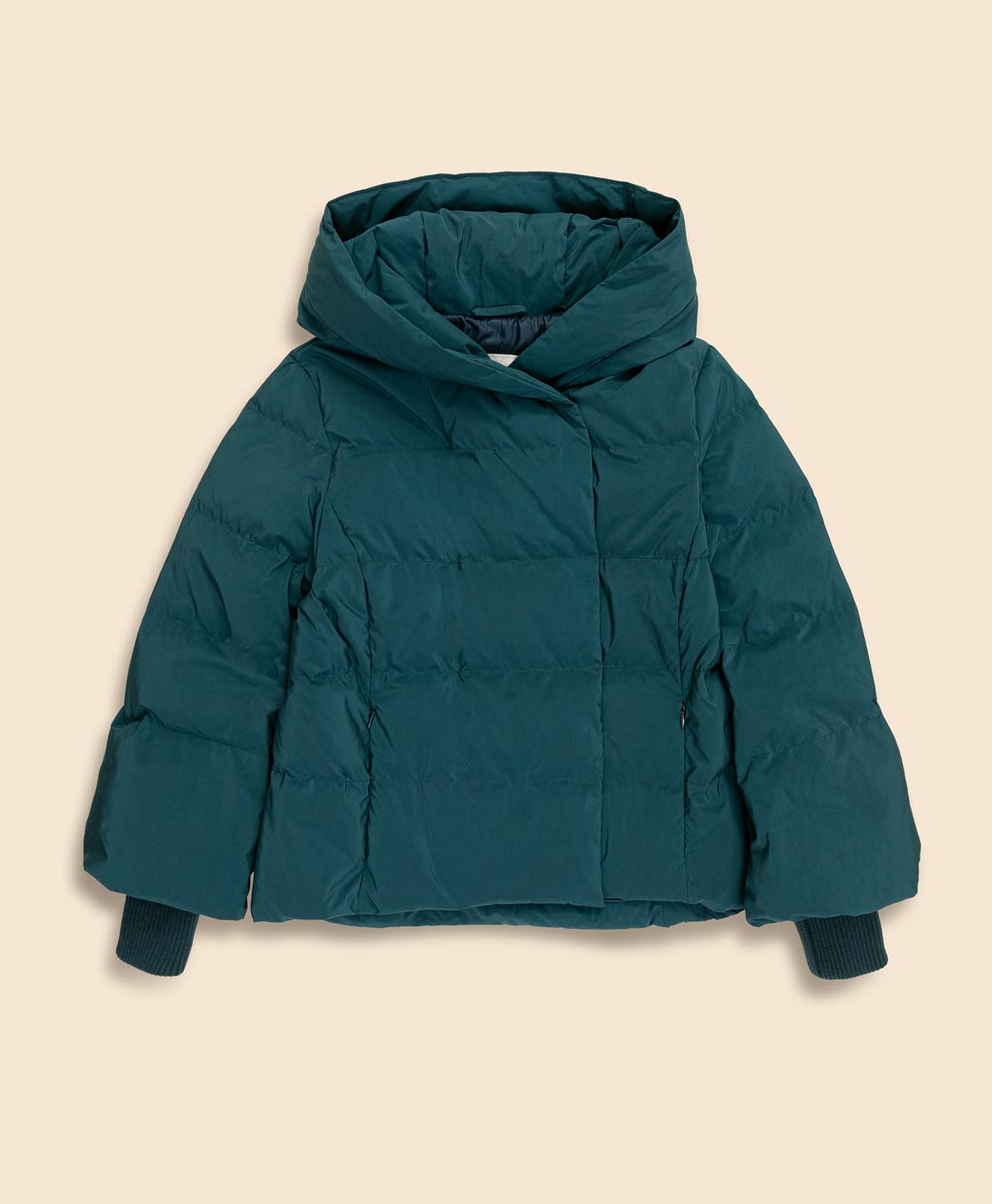 ショールカラー風にもアレンジ可能なフードを備えた、ショートパッファーダウンコート