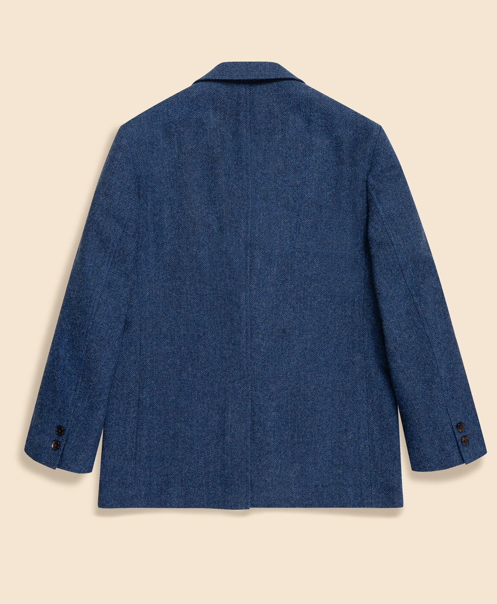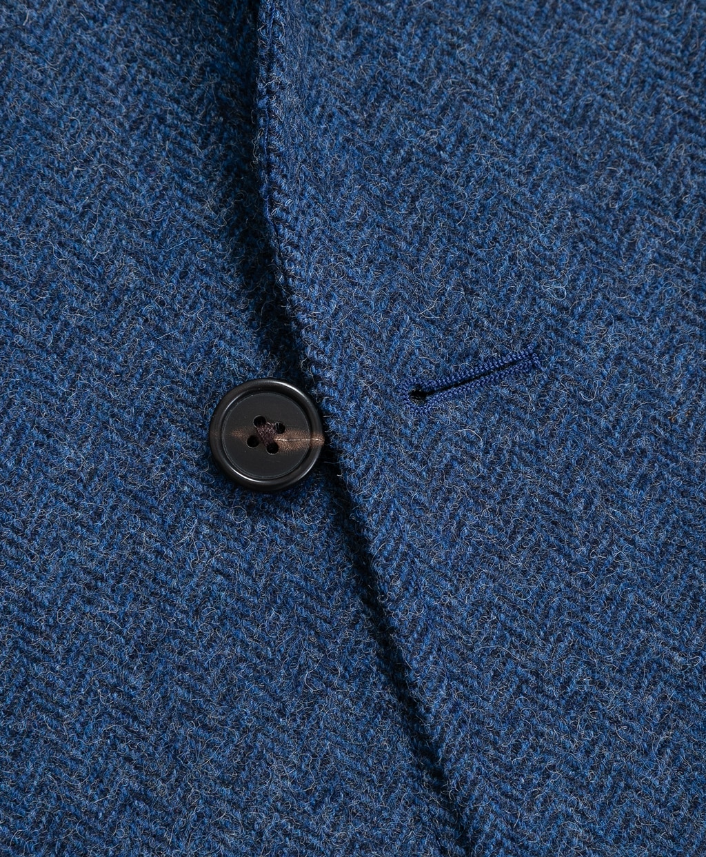 シェットランド諸島に生息する小型の羊から採れたシェットランドウールをアメリカへ持ち込み、丹念に織り上げられたヘリンボーン生地を使用。シェットランドウールは一般的なウールと比較して軽量で保温性が高く、耐久性を兼ね備えた貴重な素材です。これを”Made in USA” の服作りを牽引する縫製工場のひとつであるニューヨークのFerrara Manufacturing(フェラーラ・マニュファクチャリング) で縫製しました。生地の風合いを最大限に活かしつつゆったりとした身幅でリラックスして着用できる、伝統的なアメリカンスタイルのジャケットに仕上がっています。ブルックス ブラザーズを代表する、ウエストの絞りのないボックス型の段返り3釦センターベント仕様です。