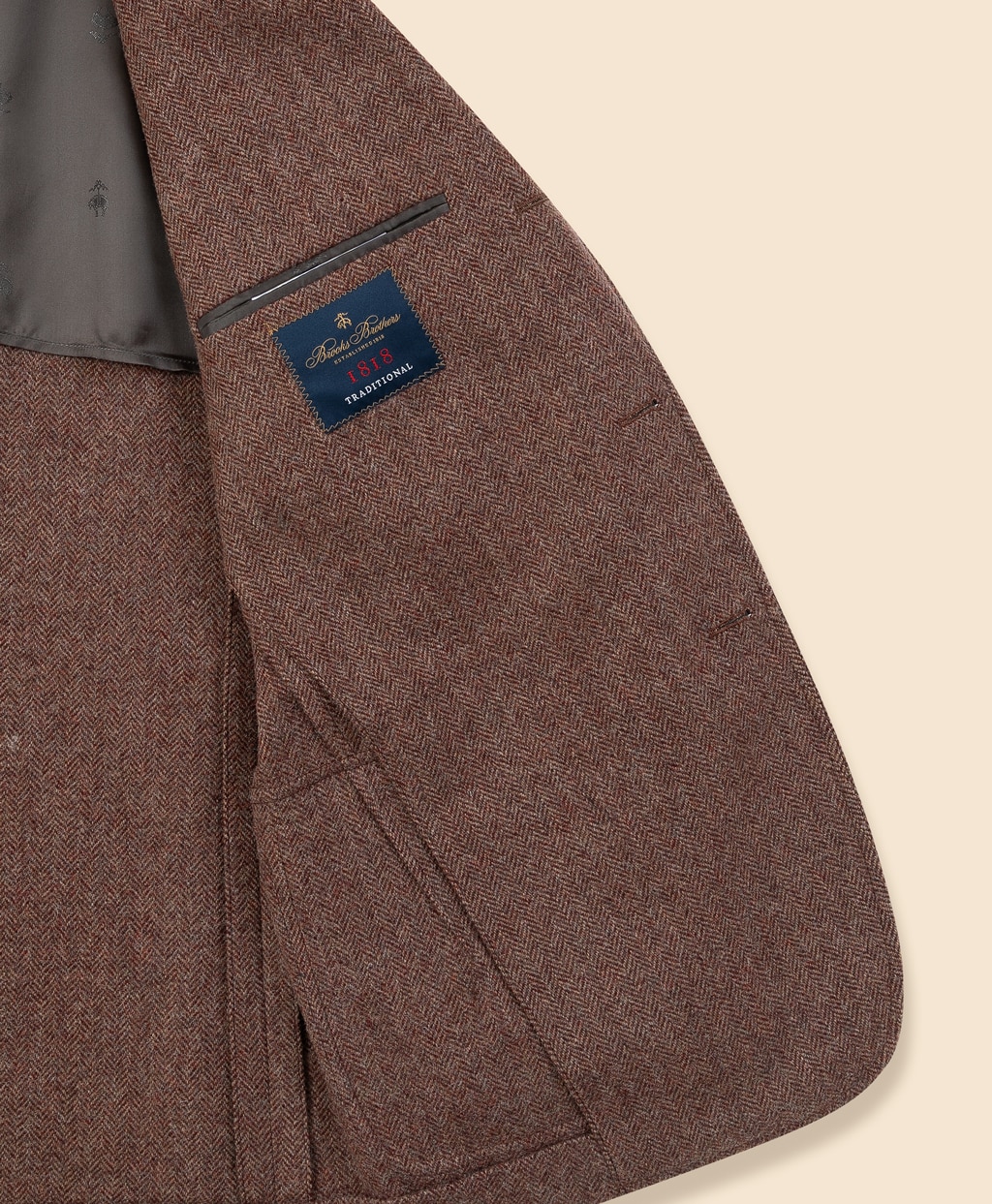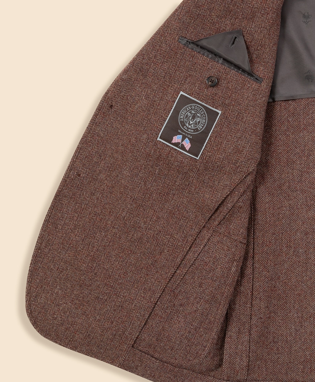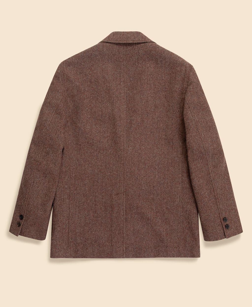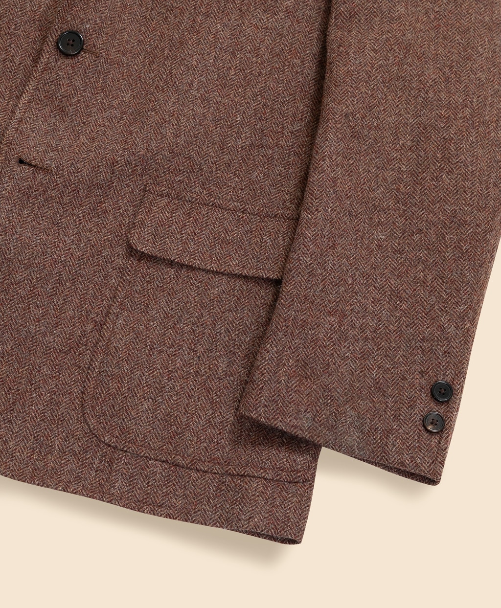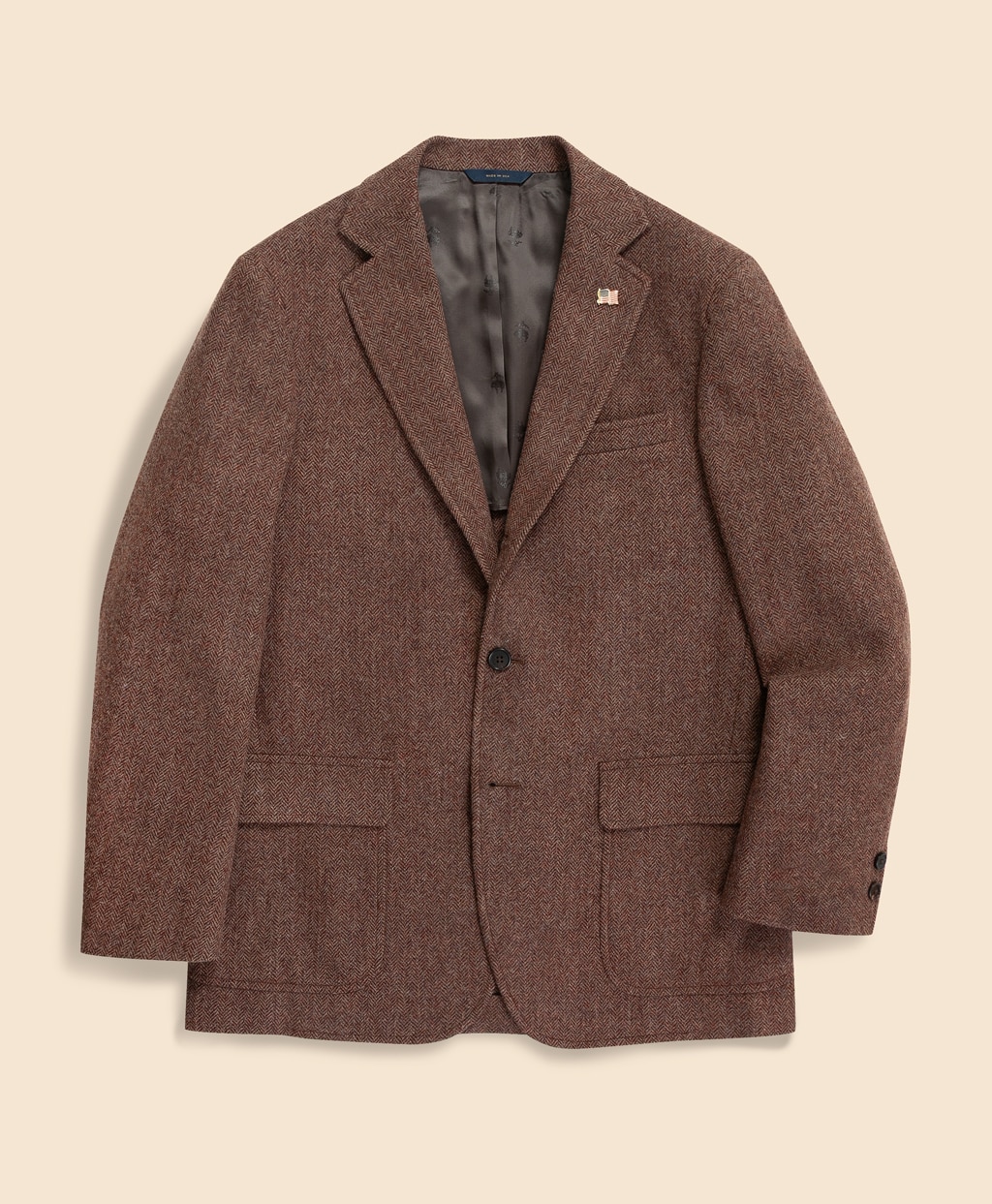 シェットランド諸島に生息する小型の羊から採れたシェットランドウールをアメリカへ持ち込み、丹念に織り上げられたヘリンボーン生地を使用。シェットランドウールは一般的なウールと比較して軽量で保温性が高く、耐久性を兼ね備えた貴重な素材です。これを”Made in USA” の服作りを牽引する縫製工場のひとつであるニューヨークのFerrara Manufacturing(フェラーラ・マニュファクチャリング) で縫製しました。生地の風合いを最大限に活かしつつゆったりとした身幅でリラックスして着用できる、伝統的なアメリカンスタイルのジャケットに仕上がっています。ブルックス ブラザーズを代表する、ウエストの絞りのないボックス型の段返り3釦センターベント仕様です。