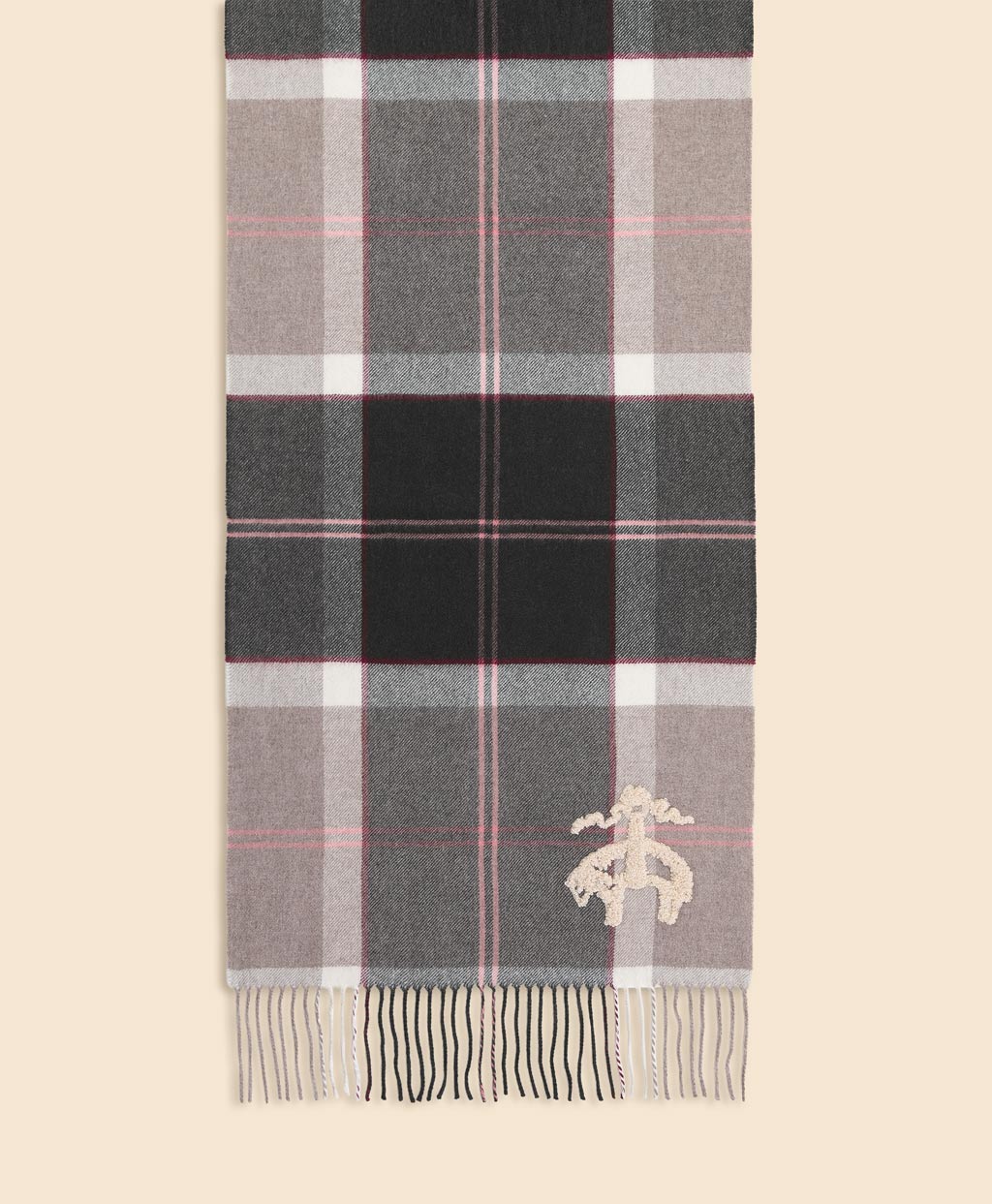 立体感のあるさがら刺繍で施された、モコモコとしたGF(ゴールデン フリース)ロゴが愛らしいオブロングスカーフ。グレーベースにピンクなどを配したフェミニンな配色のタータンチェック柄で仕上げました。100%カシミヤ素材を使用しており上品な光沢と滑らかな肌触りの良さを楽しめます。