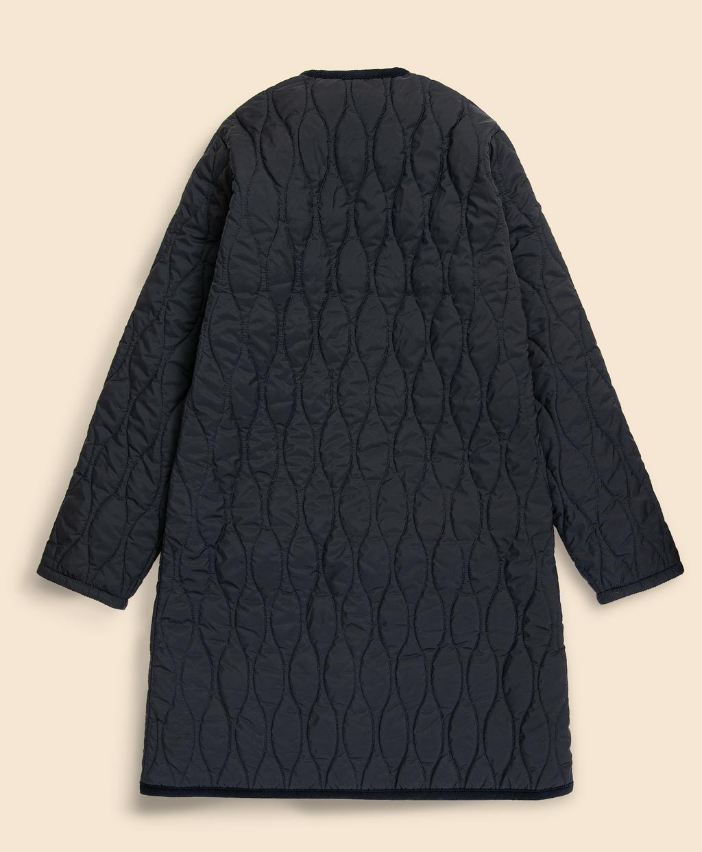 ラウンドカラーとエレガントなAラインシルエットが特徴の「イブシャム」。キルトパターンを伝統的なダイヤモンドキルティングからミリタリーウェア由来のオニオンキルティングへ変更し、アメリカンテイストをプラスしました。ダイヤモンドキルティングと比較してステッチによる抑えが緩やかなため、ソフトな生地感で着用時のシルエットにもフェミニンなムードが漂います。また、着丈を5cmほど長めに設定することで、よりエレガントに仕上げました。