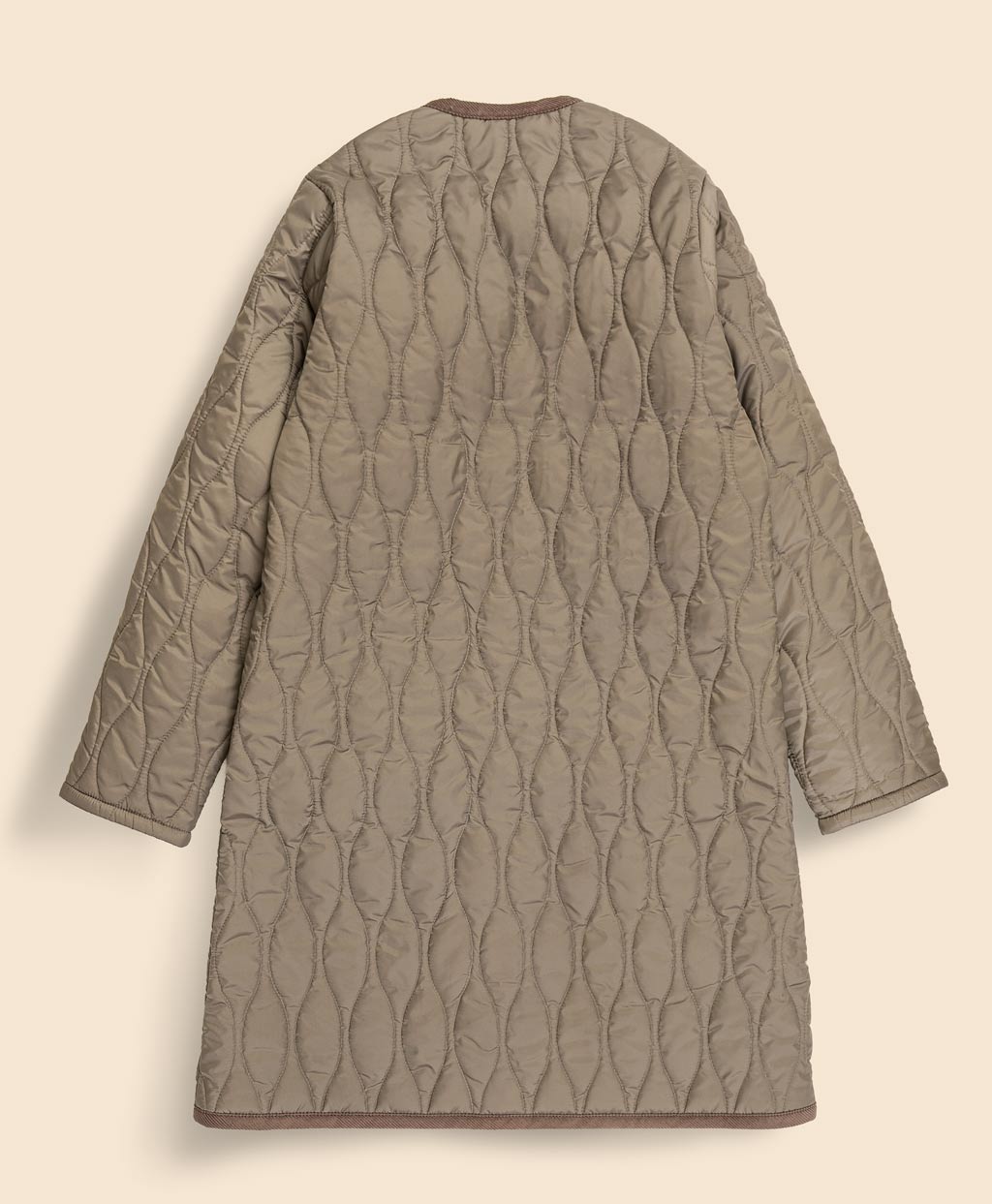 ラウンドカラーとエレガントなAラインシルエットが特徴の「イブシャム」。キルトパターンを伝統的なダイヤモンドキルティングからミリタリーウェア由来のオニオンキルティングへ変更し、アメリカンテイストをプラスしました。ダイヤモンドキルティングと比較してステッチによる抑えが緩やかなため、ソフトな生地感で着用時のシルエットにもフェミニンなムードが漂います。また、着丈を5cmほど長めに設定することで、よりエレガントに仕上げました。