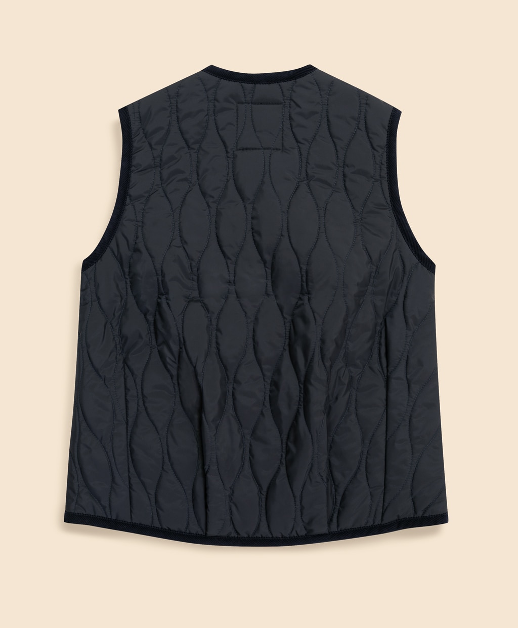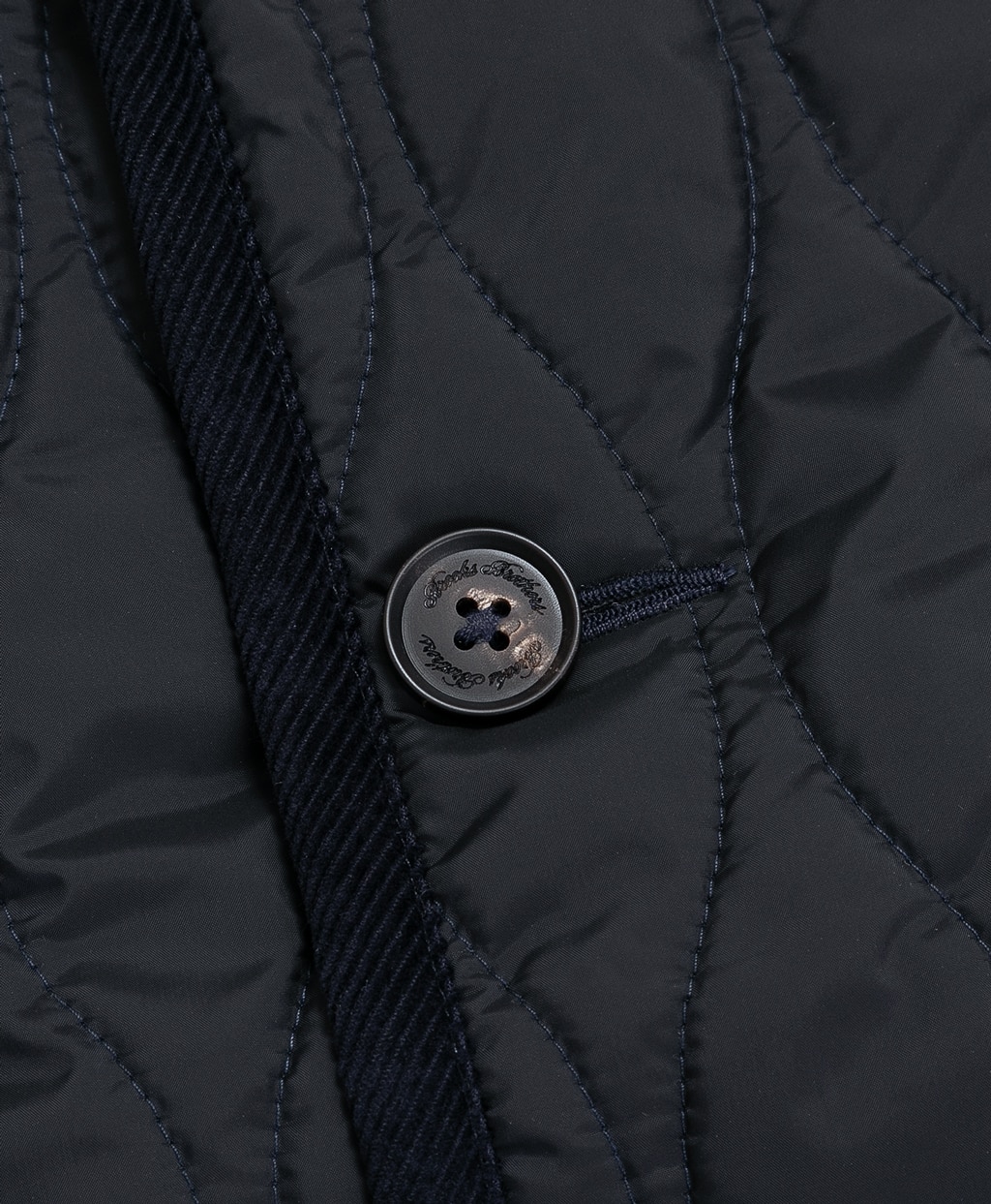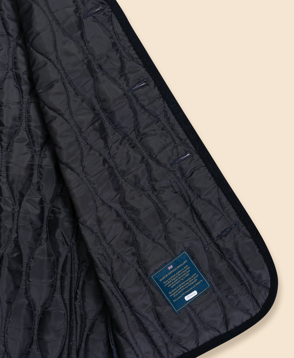 デイリーなコーディネートに馴染む現代的なデザインで、コートなどのインナーとしてもアウターとしても着用可能な「ソーンハム」。キルトパターンを伝統的なダイヤモンドキルティングからミリタリーウェア由来のオニオンキルティングへ変更し、アメリカンテイストをプラスしました。ダイヤモンドキルティングと比較してステッチによる抑えが緩やかなため、ソフトな生地感で着用時のシルエットにもフェミニンなムードが漂います。オリジナルモデルのスナップボタンは、ブランドロゴ入り水牛ボタンに変更し、よりエレガントな印象に仕上げています。