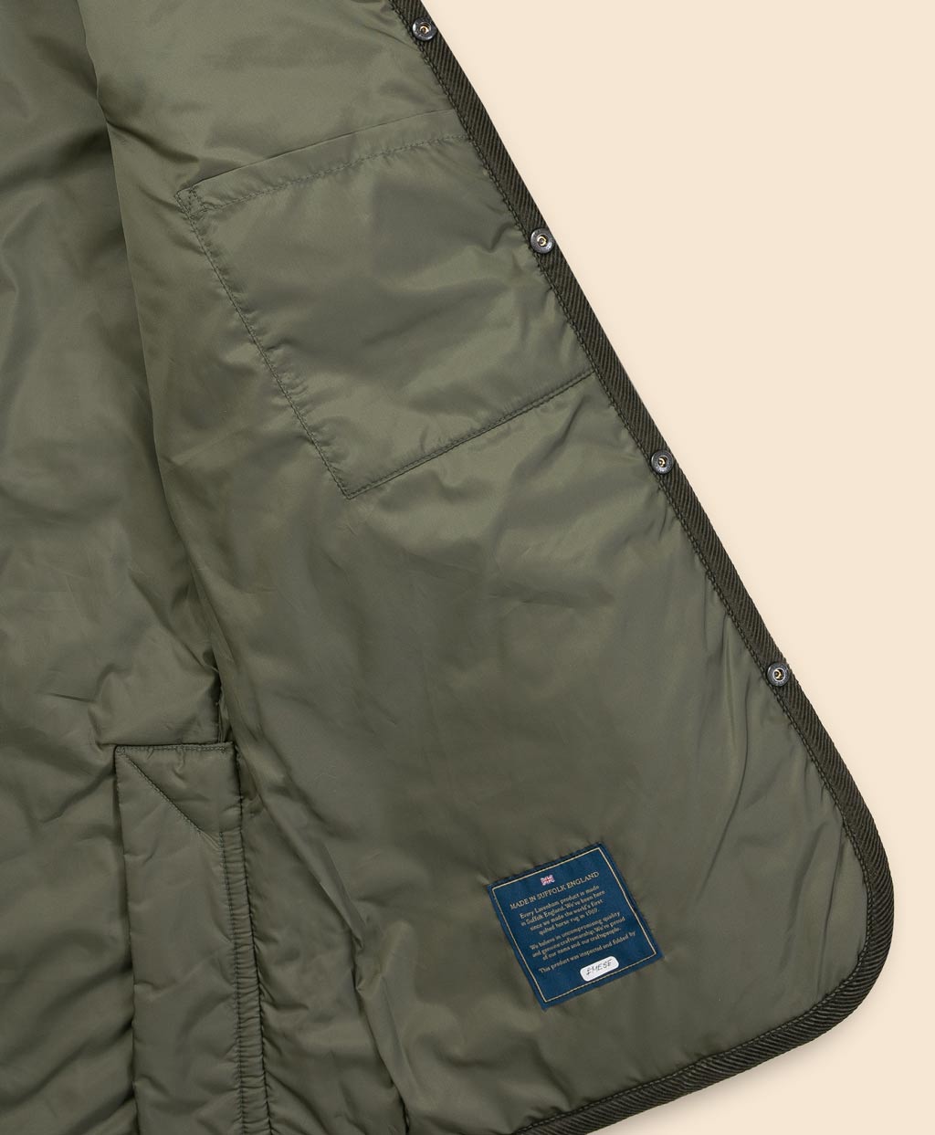 クラシックな雰囲気を持ちながらも、身幅や肩幅にゆとりを持たせ袖幅や襟はコンパクトに調整した現代的なデザインの定番モデル「デンハム」。キルトパターンを伝統的なダイヤモンドキルティングからミリタリーウェア由来のオニオンキルティングへ変更し、やや無骨でタフなニュアンスをプラスしました。デイリーなカジュアルスタイルにはもちろんの事、着丈が長めに設定されているため通勤時にスーツの上から羽織っていただくのもおすすめです。秋冬から春先まで活躍する、汎用性の高いアウターウェアです。
