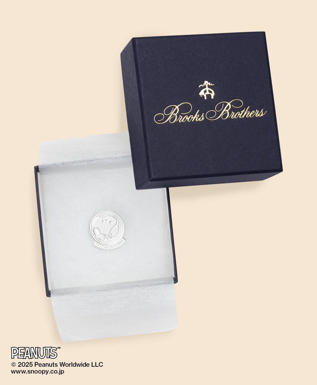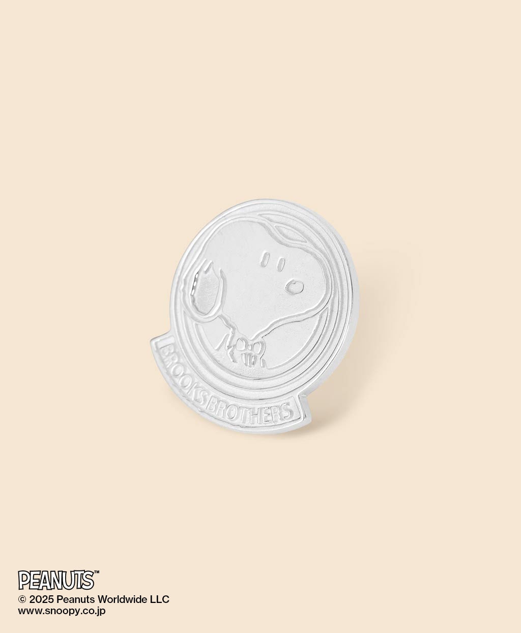 銀の割合が高くスターリングシルバー製のピンズに、紺ブレザーとボウタイを身につけたスヌーピーをデザイン。フレーム下部にはブルックス ブラザーズのブランドネームを刻印しました。ブレザーの襟もとに添えれば、クラシックな装いに上質な遊び心を加えることができます。