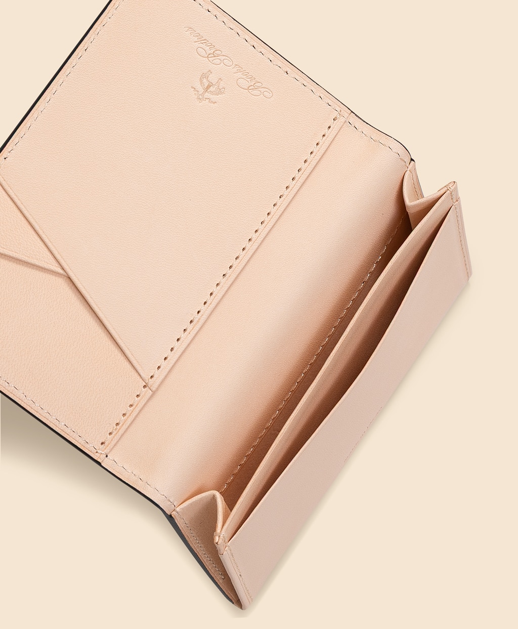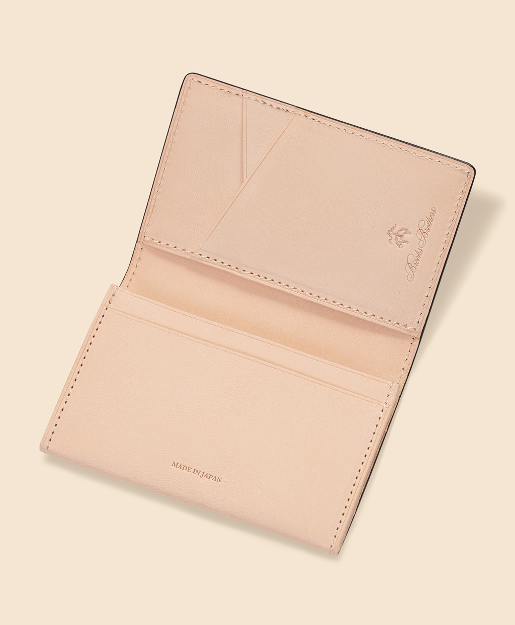 丈夫で耐久性の高いカウレザーを用いたカードケースです。外側にはブルックス ブラザーズのシグネチャーストライプであるBB#1(ナンバーワン)ストライプを型押ししました。コンパクトで表面に飾りなどの無いフラットな形状は、ポケットに入れても服のシルエットに響きにくく、出し入れの際にも引っ掛かりの無い使いやすさも兼ね備えています。使い込むほどに愛着の増す、上質でタイムレスなデザインのカードケースはプレゼントにもお薦めです。