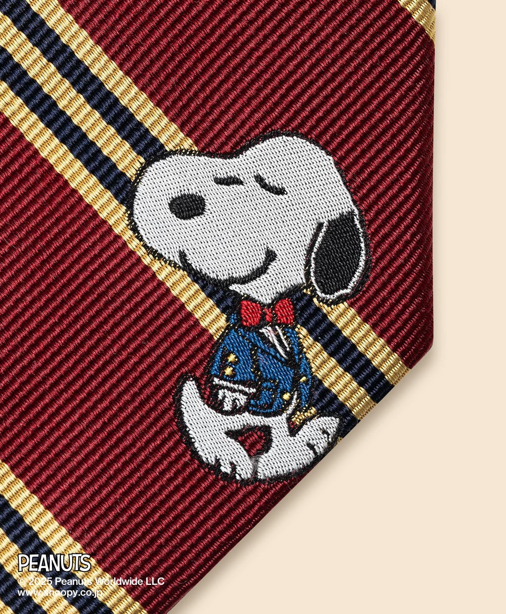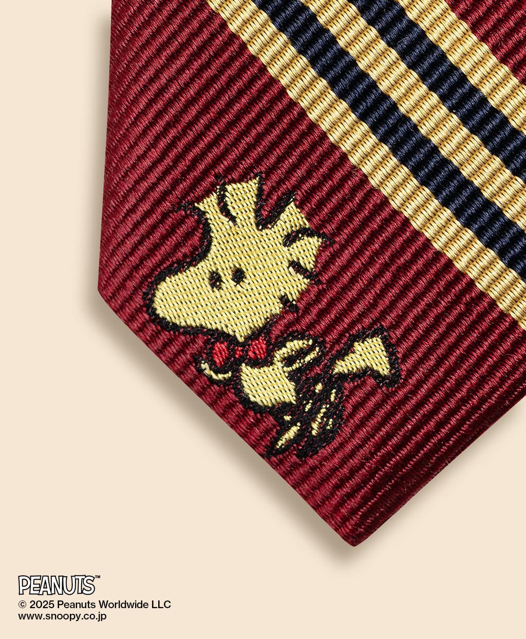ブルックス ブラザーズの定番であるBB#1(ナンバーワン)ストライプタイをベースに、大剣にスヌーピー、小剣にウッドストックをジャガード織りで表現しました。タイを締める際にあえて大剣と小剣をずらすと、隠れたウッドストックが覗く仕掛けに。伝統的なスタイルを保ちながら、大人のユーモアを楽しめる一本です。