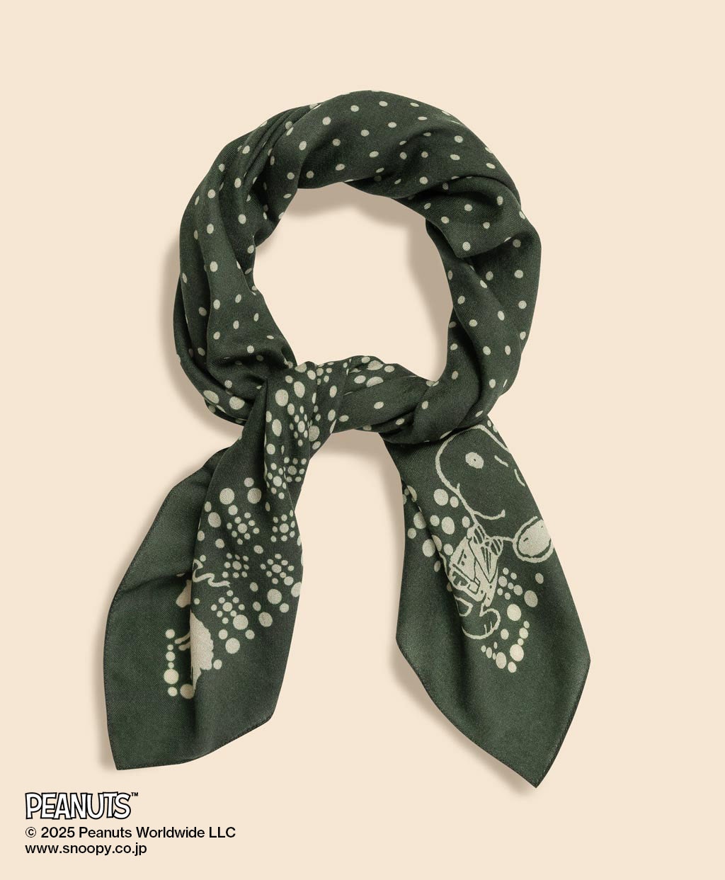 上質なカシミヤ100%のスカーフです。カジュアルスタイルにも合わせやすい、バンダナ風の柄をあしらったデザイン。シーズンのキー・カラーであるオリーブをベースに、ブレザー姿のスヌーピーとゴールデン フリースをプリントしました。コラボレーションならではのユニークな表情を楽しめる一枚です。