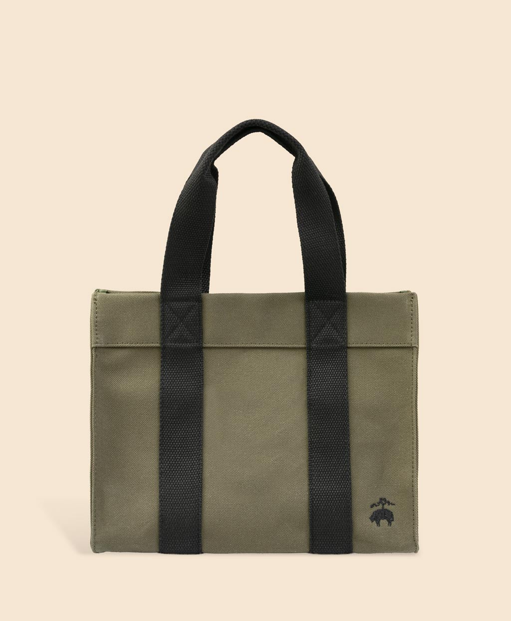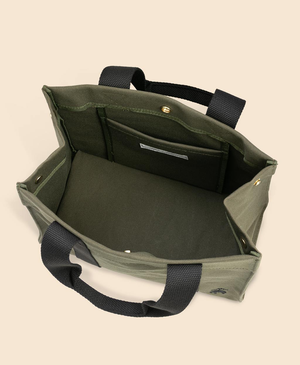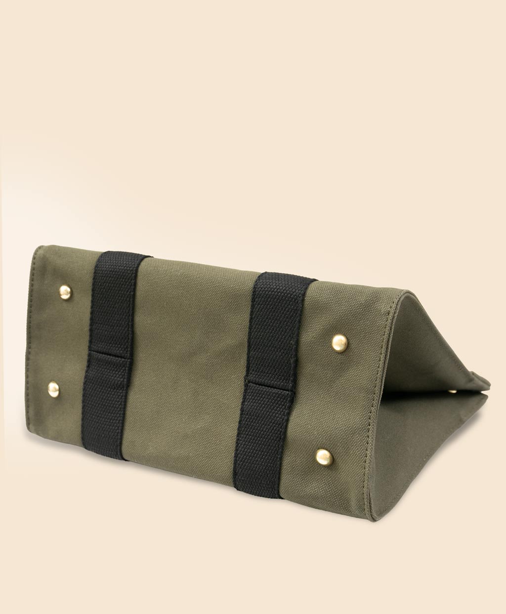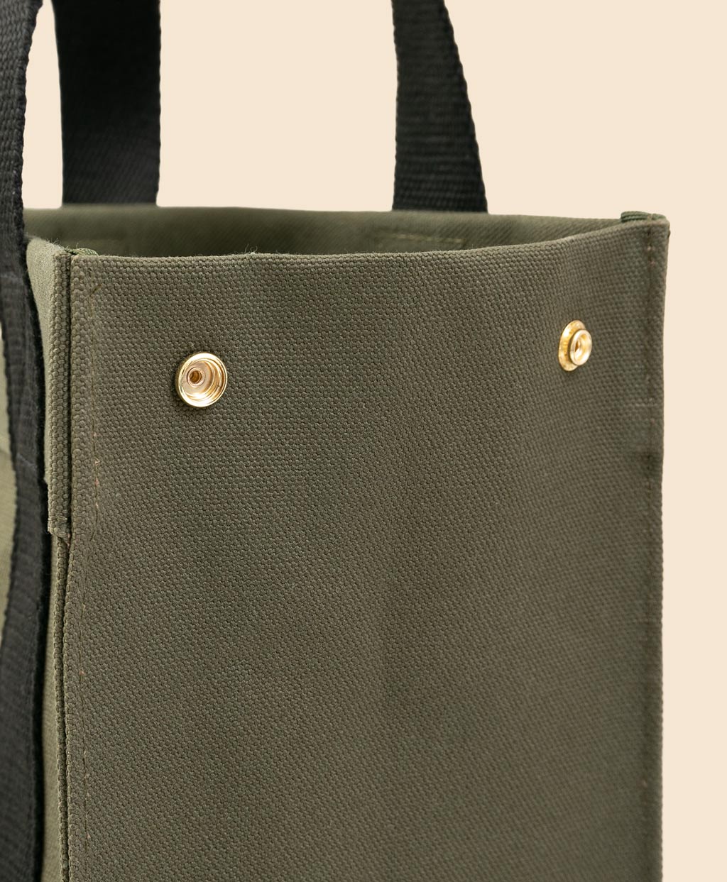 側面と開口部にはスナップボタン、内側には小物の収納に便利なポケットもあり、使い勝手の良さも特徴です。A4サイズが入る大きさで幅広くお使いいただけます。