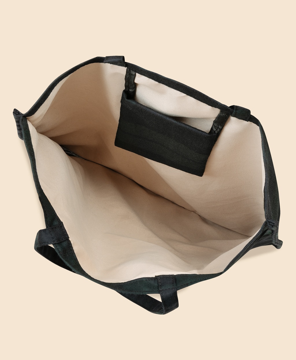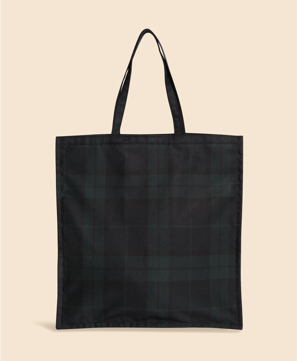 上質な日本製のウールツイル生地を使用しており、大人のカジュアルスタイルにマッチする上品な佇まいです。ブラックウォッチ柄に合わせて前面中央にはロゴがプリントされており、シンプルなデザインの中にブルックスらしさを感じさせます。男性が使用してもバランスの良い大きめサイズ。マチ無しの軽快な仕上がりなので、サブバッグやショッピングバッグとしての用途にもお薦めです。