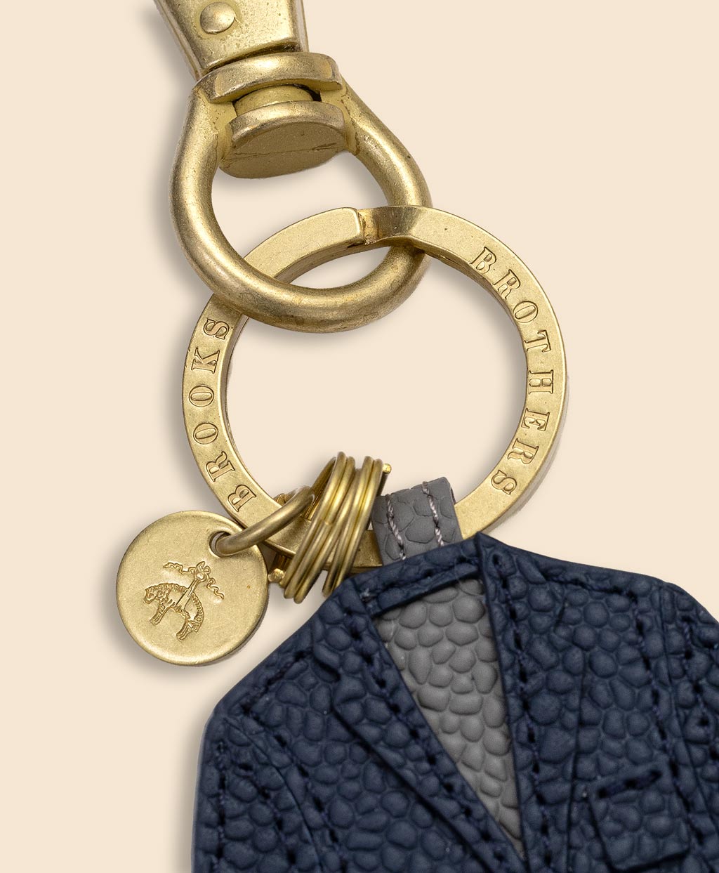 ブランドアイコンのネイビーブレザーをかたどったアイコニックなキーフォブ